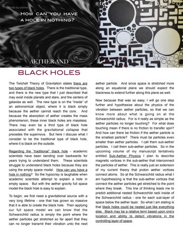 aether particle. And since space is stretched more along an equatorial plane we should expect the blackness to extend further along this plane as well. Now because that was so easy, I will go one step further and hypothesize about the physics of the vibration between aether particles, so that we can know more about what is going on at the Schwarzchild radius. For is it really as simple as the aether particles no longer touching? For what does touching mean if there is no friction to transfer spin? And how can there be friction if the aether particle is the smallest particle? There must be particles even smaller than aether particles. I call them sub-aether particles. I call them sub-aether particles. So in the upcoming volume of my manuscript tentatively entitled Sub-Aether Physics I plan to describe magnetic vortices in the sub-aether that interconnect the particles of aether. This is really just an extension of my current theory that proton aether vortices connect atoms. So at the Schwarzchild radius what I am hypothesizing is that the sub-aether vortices that connect the aether particles get stretched to the point where they break. This line of thinking leads me to predict additional nested Schwarzchild radii inside of the Schwarzchild radius - one for each sub-layer of space below the aether layer. So what I am stating is that black holes could be nested just like everything else. Black may be a relative term based upon one’s location and ability to detect vibrations in the controlling layer of space.