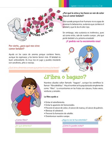 ¿Fibra o bagazo? Nuestras abuelas solían llamarlo “bagazo”, aunque los científicos la llaman “fibra dietética”. Hoy el nombre se ha popularizado simplemente como “fibra”. La encontramos en las frutas con cáscara, frutos secos, verduras y cereales. La fibra ayuda a: • Evitar el estreñimiento. • Evitar la aparición de hemorroides. • Prevenir el cáncer de colon, el cáncer de mama y el cáncer de pulmón. • Eliminar el colesterol. • Prevenir la formación de celulitis. • Desintoxicar nuestro cuerpo. ¿Comes fibra? ¿En qué alimentos?