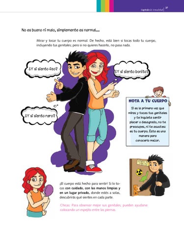 ¡El cuerpo está hecho para sentir! Si lo tocas con cuidado, con las manos limpias y en un lugar privado, donde estés a solas, descubrirás qué sientes en cada parte. Chicas: Para observar mejor sus genitales, pueden ayudarse colocando un espejito entre las piernas.