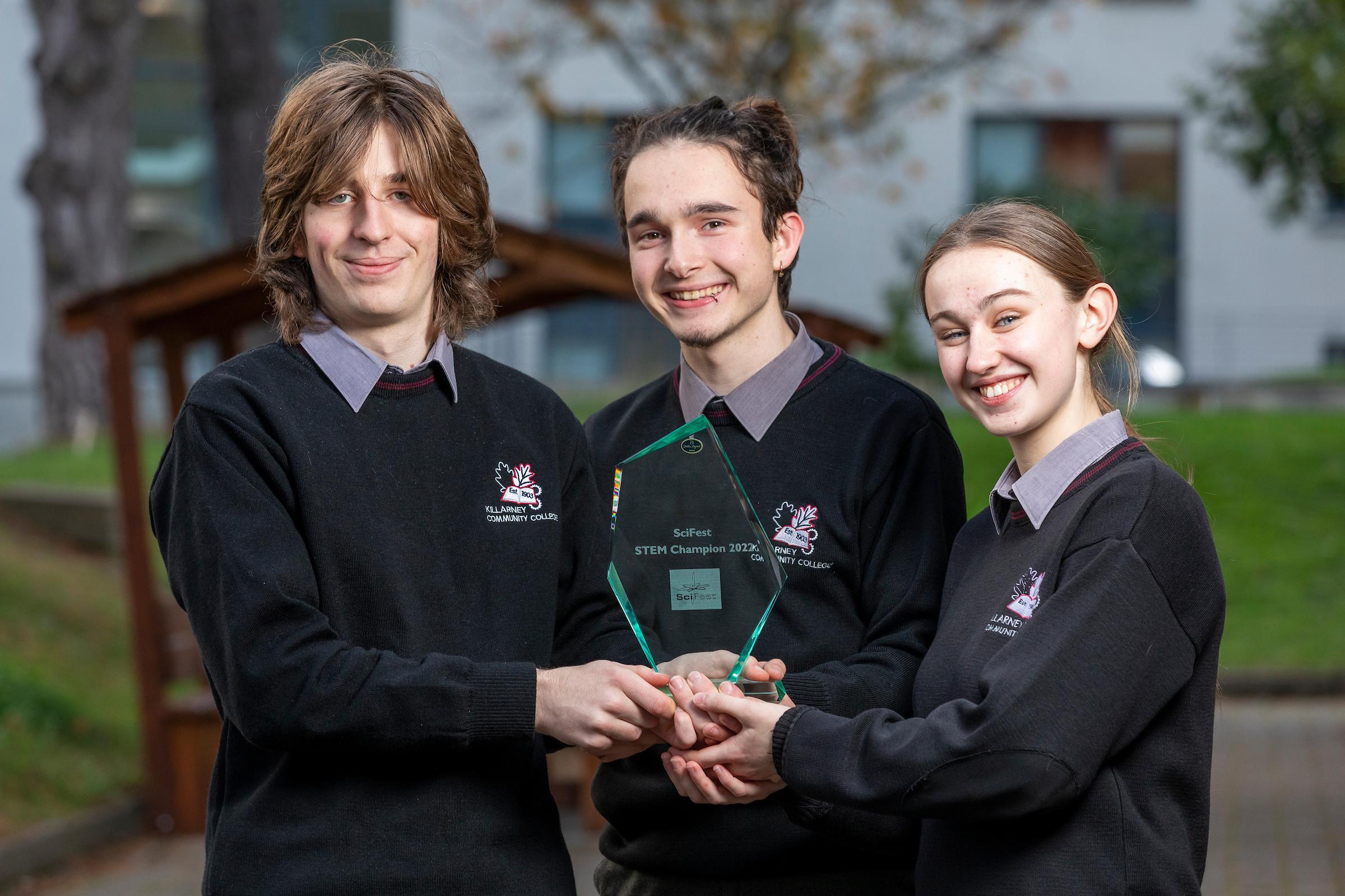 The National Final awards ceremony, held in the Marino Conference Centre in Dublin on 25 November, was attended by student finalists from all over Ireland Liam, Rachel and Luke were presented with the SciFest STEM Champions 2022 Award by Sheila Porter, SciFest Founder and CEO The students secured their place at the National Final after their victory at the SciFest regional final at MTU Kerry.