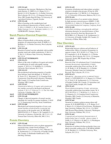 CFW 55:A54 Effects of hydrocolloids on the pasting and paste properties of commercial pea starch. H. KIM (1), J. BeMiller (1). (1) Purdue University, West Lafayette, IN, U.S.A. CFW 55:A38 Reaction of octenyl succinic anhydride with insoluble granular starch and soluble maltodextrin. Y. BAI (1), Y. Shi (1). (1) Kansas State University, Manhattan, KS, U.S.A. CFW 55:A57 WITHDRAWN CFW 55:A71 Effects of the order of addition of reagent and catalyst on modiďŹ cation of starch with rapidly reacting reagents. Z. SUI (1), J. N. BeMiller (1). (1) Purdue University, West Lafayette, IN, U.S.A. CFW 55:A75 Physicochemical and pasting properties of starches from ďŹ eld pea, lentil and chickpea. N. WANG (1), R. Toews (2), L. Maximiuk (2). (1) Canadian Grain Commission, Grain Research Laboratory, Winnipeg, MB, Canada; (2) Canadian Grain Commission, Winnipeg, MB, Canada CFW 55:A51 'ELATINIZATION BEHAVIOR OF ORGANIC AND CONVENTIONAL rice starches assessed by rheological and thermal ANALYSES 0 )% 9 6ODOVOTZ 4HE /HIO 3TATE University, Columbus, OH, U.S.A. CFW 55:A43 WITHDRAWN CFW 55:A48 Changes of physical properties of octenyl succinic anhydride rice starches by gamma irradiation. J. HAN (1). (1) Sangmyung University, Seoul, South Korea CFW 55:A60 Rheological and structural properties of waxy corn MUTANT STARCHES AS HYDROLYZED BY ISOAMYLASE AND beta-amylase in the granular state. M. MENDEZMONTEALVO (1), Y. Wang (1), M. Campbell (2). (1) University of Arkansas, Fayetteville, AR, U.S.A.; (2) Truman State University, Kirksville, MO, U.S.A.
