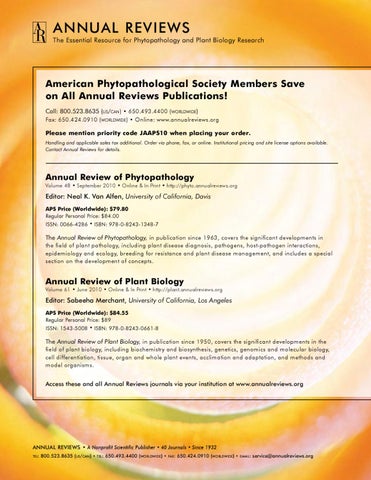 American Phytopathological Society Members Save on All Annual Reviews Publications! Call: 800.523.8635 (US/CAN) • 650.493.4400 (WORLDWIDE) Fax: 650.424.0910 (WORLDWIDE) • Online: www.annualreviews.org Please mention priority code JAAPS10 when placing your order. Handling and applicable sales tax additional. Order via phone, fax, or online. Institutional pricing and site license options available. Contact Annual Reviews for details.