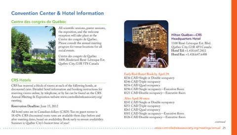 CRS Hotels CRS has reserved a block of rooms at each of the following hotels, at discounted rates. Detailed hotel information and booking instructions for reserving rooms online, by telephone, or by fax can be found on the CRS Annual Meeting & Exposition website www.controlledreleasesociety.org/ meeting. Reservation Deadline: June 15, 2012 All hotel rates are in Canadian dollars (CAD). Tax on guest rooms is 18.42%. CRS discounted room rates are available three days before and after meeting dates, based on availability. Book early to ensure availability. Summer is Québec City’s busiest time of year!
