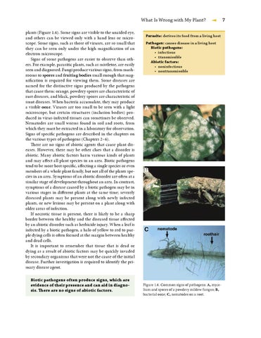 What Is Wrong with My Plant? ◀ 7 plants (Figure 1.6). Some signs are visible to the unaided eye, and others can be viewed only with a hand lens or microscope. Some signs, such as those of viruses, are so small that they can be seen only under the high magnification of an electron microscope. Signs of some pathogens are easier to observe than others. For example, parasitic plants, such as mistletoe, are easily seen and diagnosed. Fungi produce various signs, from mushrooms to spores and fruiting bodies small enough that magnification is required for viewing them. Some diseases are named for the distinctive signs produced by the pathogens that cause them: orange, powdery spores are characteristic of rust diseases, and black, powdery spores are characteristic of smut diseases. When bacteria accumulate, they may produce a visible ooze. Viruses are too small to be seen with a light microscope, but certain structures (inclusion bodies) produced in virus-infected tissues can sometimes be observed. Nematodes are small worms found in soil and roots, from which they must be extracted in a laboratory for observation. Signs of specific pathogens are described in the chapters on the various types of pathogens (Chapters 2–6). There are no signs of abiotic agents that cause plant diseases. However, there may be other clues that a disorder is abiotic. Many abiotic factors harm various kinds of plants and may affect all plant species in an area. Biotic pathogens tend to be more host specific, affecting a single species or even members of a whole plant family, but not all of the plants species in an area. Symptoms of an abiotic disorder are often at a similar stage of development throughout an area. In contrast, symptoms of a disease caused by a biotic pathogen may be in various stages in different plants at the same time; severely diseased plants may be present along with newly infected plants, or new lesions may be present on a plant along with older areas of infection. If necrotic tissue is present, there is likely to be a sharp border between the healthy and the diseased tissue affected by an abiotic disorder such as herbicide injury. When a leaf is infected by a biotic pathogen, a halo of yellow to red to purple dying cells is often formed at the margin between healthy and dead cells. It is important to remember that tissue that is dead or dying as a result of abiotic factors may be quickly invaded by secondary organisms that were not the cause of the initial disease. Further investigation is required to identify the primary disease agent. Biotic pathogens often produce signs, which are evidence of their presence and can aid in diagnosis. There are no signs of abiotic factors.