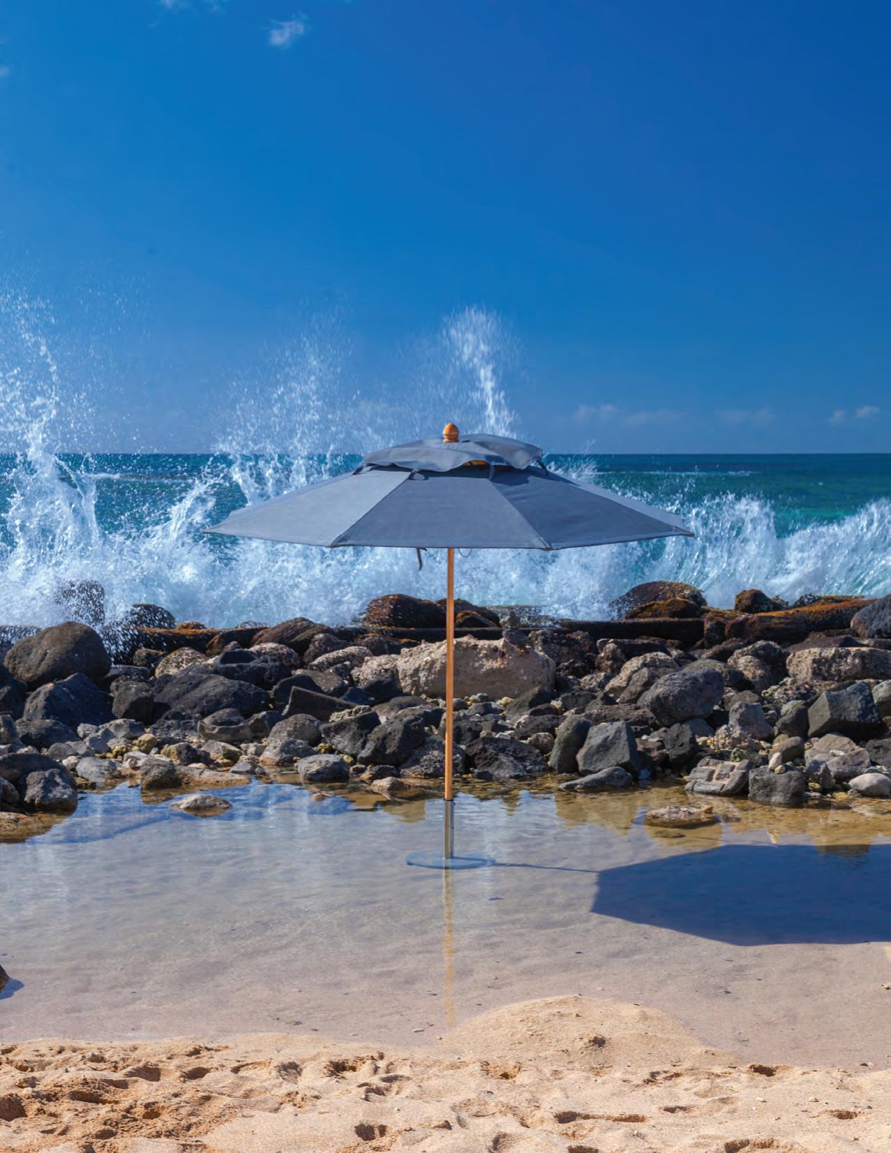 STUDENTS’ DESIGN CREATIVITY BOOSTING COMMUNITIES ON THE COVER: CUSTOM-MADE UMBRELLAS BY TROPICAL J’S ARE THE PERFECT COMPLEMENTS FOR ENJOYING A HAWAIIAN BEACH.
