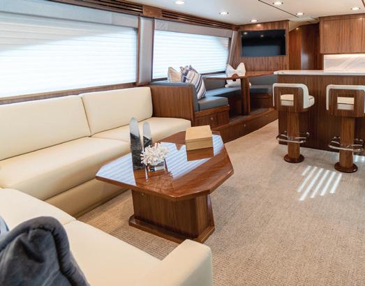 FABRICS SHOWN Head and hull liner, Sunbrella Horizon, Capriccio Cloud; wall lining, Sunbrella, Demo Putty; Lounges, Sunbrella, Level Pumice.