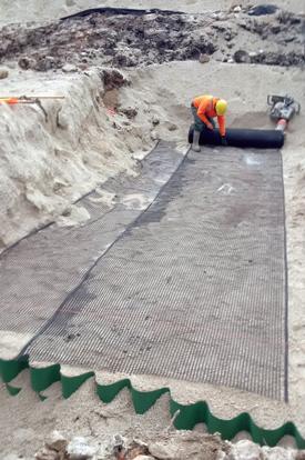 For example, using a geogrid or geotextile for subgrade stabilization allows a construction team to reduce the amount of rock hauled in to a jobsite and use site soil to build structures necessary, reducing the amount of energy expended from extracting the rock to delivering it, which typically involves moving hundreds of loads of rock from a quarry to a jobsite.
