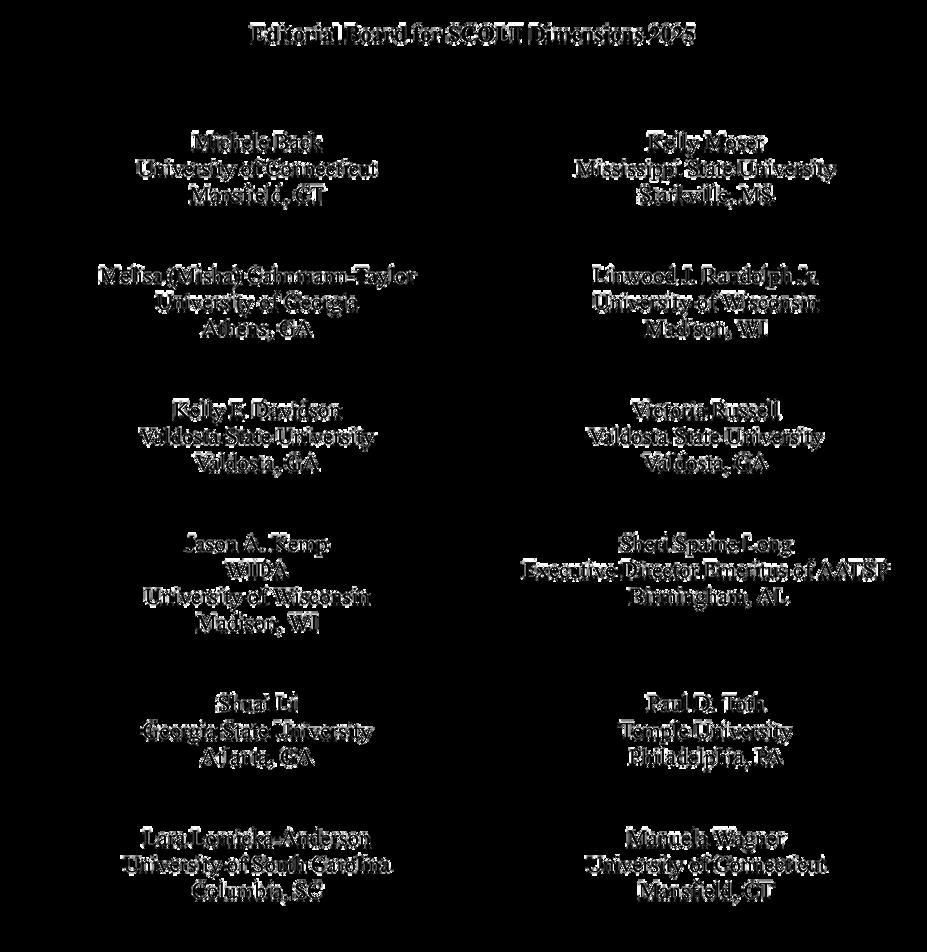 SCOLT members who contributed to this book are: Dr. Victoria Russell (co-editor), Dr. Kathryn Murphy-Judy (co-editor), Dr. Krista Chambliss, Dr. Leslie Baldwin, Dr. Paula Garrett-Rucks, Dr. Bobby Hobgood, Meredith McDonald White, Jenniffer Whyte, and Kimberly M. Winslow, Dr. Kristin Davin, and Dr. James Coda.