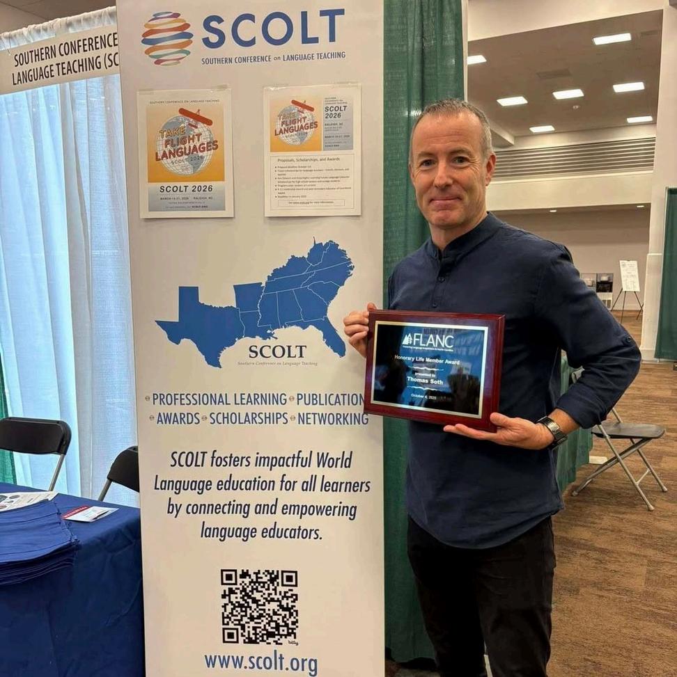 SCOLT ACTFL Representative , Thomas (Tom) Soth, was recently recognized for his longtime contributions and service to World Language education as the 2025 FLANC Honorary Life Member Award.