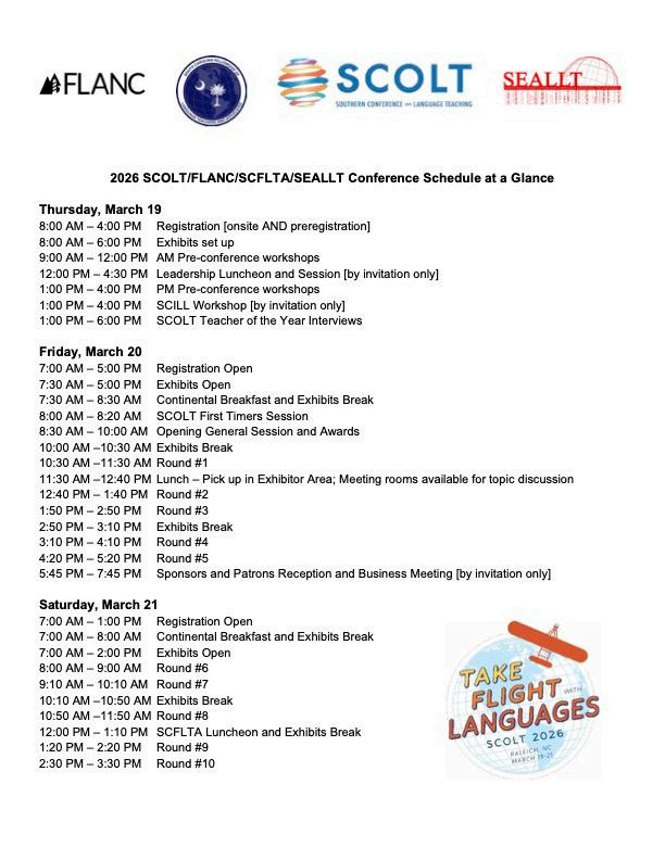 The 2026 SCOLT/FLANC/SCFLTA/SEALLT Conference will be held in Raleigh, NC March 19-21, where we will “Take Flight with Languages”!