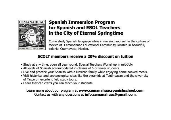 The student with the winning entry will receive $50 and the student’s teacher will receive a free SCOLT Sponsor membership.