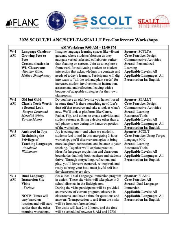Check out the preconference workshops We’ve got our top presenters from the SCOLT region offering cutting-edge workshops on Thursday, March 19, before the main conference opens on Friday. These include an opportunity to visit Dual Language Immersion sites in the Raleigh area as well as half-day sessions from Heather Giles and Melissa Shaughnessy; Raegan Lemmond, Meredith White, and Tavane Moore; Annabelle Williamson (La Maestra Loca); Diego Teatin, Monica Rodriguez, and Noemy Orozco; Christin Campbell; Nora Santillan, Fran Avere, Nicolette Grant, and Emily Bivens. Our keynote speaker is newly named ACTFL Teacher of the Year, Nathan Campbell from Pennsylvania. We’ll also have updates from ACTFL President, Krishauna Hines-Gaither, and ACTFL Executive Director, Larry Paska Visit http://www.scolt.org to register and reserve hotel. Come to experience SCOLT with us!
