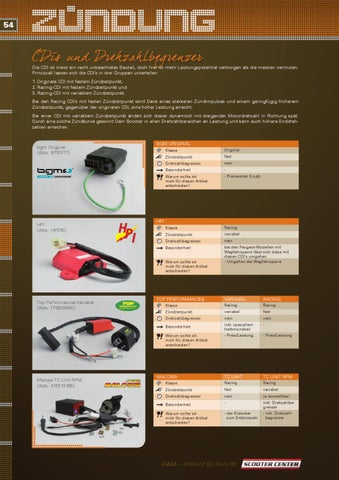 zundung Die CDI ist meist ein recht unbeachtetes Bauteil, doch hier ist mehr Leistungspotential verborgen als die meisten vermuten. Prinzipiell lassen sich die CDI’s in drei Gruppen unterteilen: 1. Originale CDI mit festem Zündzeitpunkt, 2. Racing-CDI mit festem Zündzeitpunkt und 3. Racing-CDI mit variablem Zündzeitpunkt. Bei den Racing CDI’s mit festen Zündzeitpunkt wird Dank eines stärkeren Zündimpulses und einem geringfügig früherem Zündzeitpunkt, gegenüber der originalen CDI, eine höher Leistung erreicht. Bei einer CDI mit variablem Zündzeitpunkt ändert sich dieser dynamisch mit steigender Motordrehzahl in Richtung spät. Durch eine solche Zündkurve gewinnt Dein Scooter in allen Drehzahlbereichen an Leistung und kann auch höhere Enddrehzahlen erreichen.