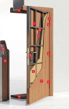 Konstrukcija rama krila vrata od čeličnih kutijastihprovila ojačanog limom. Vratasu opremljena sigurnosnom bravom sa kodiranim ključem iširokougaoom špijunkkom.Obrada štoka i krila svihspoljnih elemenata ulaznih vrata u stanove je furnirani