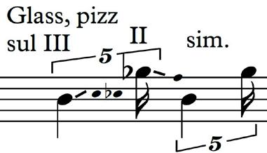 With the left hand, an empty yoghurt jar is pressed at the spot of the fingering of the given pitch. The circular change of pitches creates interesting echoes of glissandi, sempre pizz. Pizz. with the thumb, if it lies well.