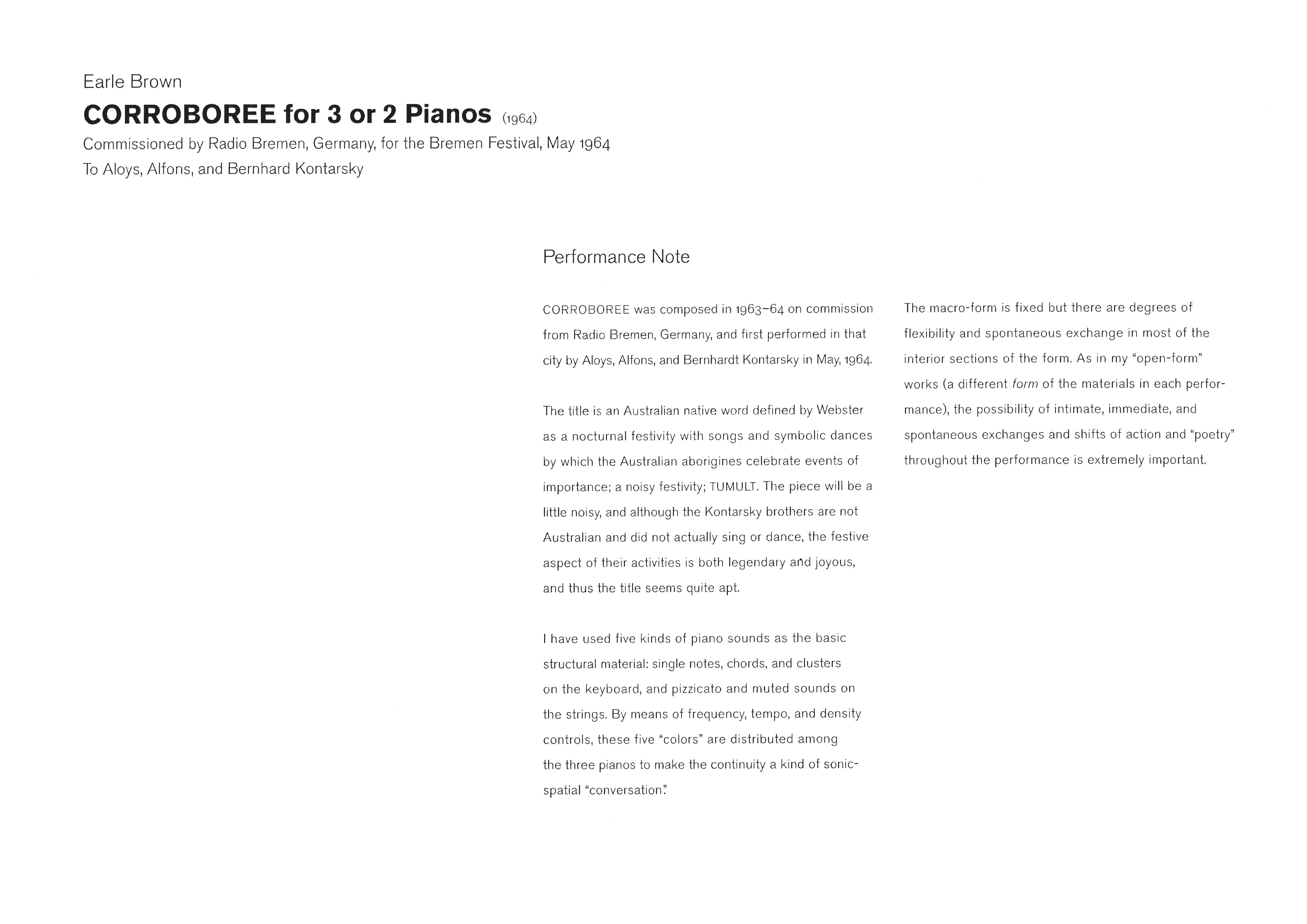 Earle Brown was born in 1926 in Lunenburg, Massachusetts, and in spirit remained a New Englander throughout his life. A major force in contemporary music and a leading composer of the American avantgarde since the 1950s, he was associated with the experimental composers John Cage, Morton Feldman and Christian Wolff, who – together with Brown – came to be known as members of the New York School. Brown died in 2002 at his home in Rye, New York.