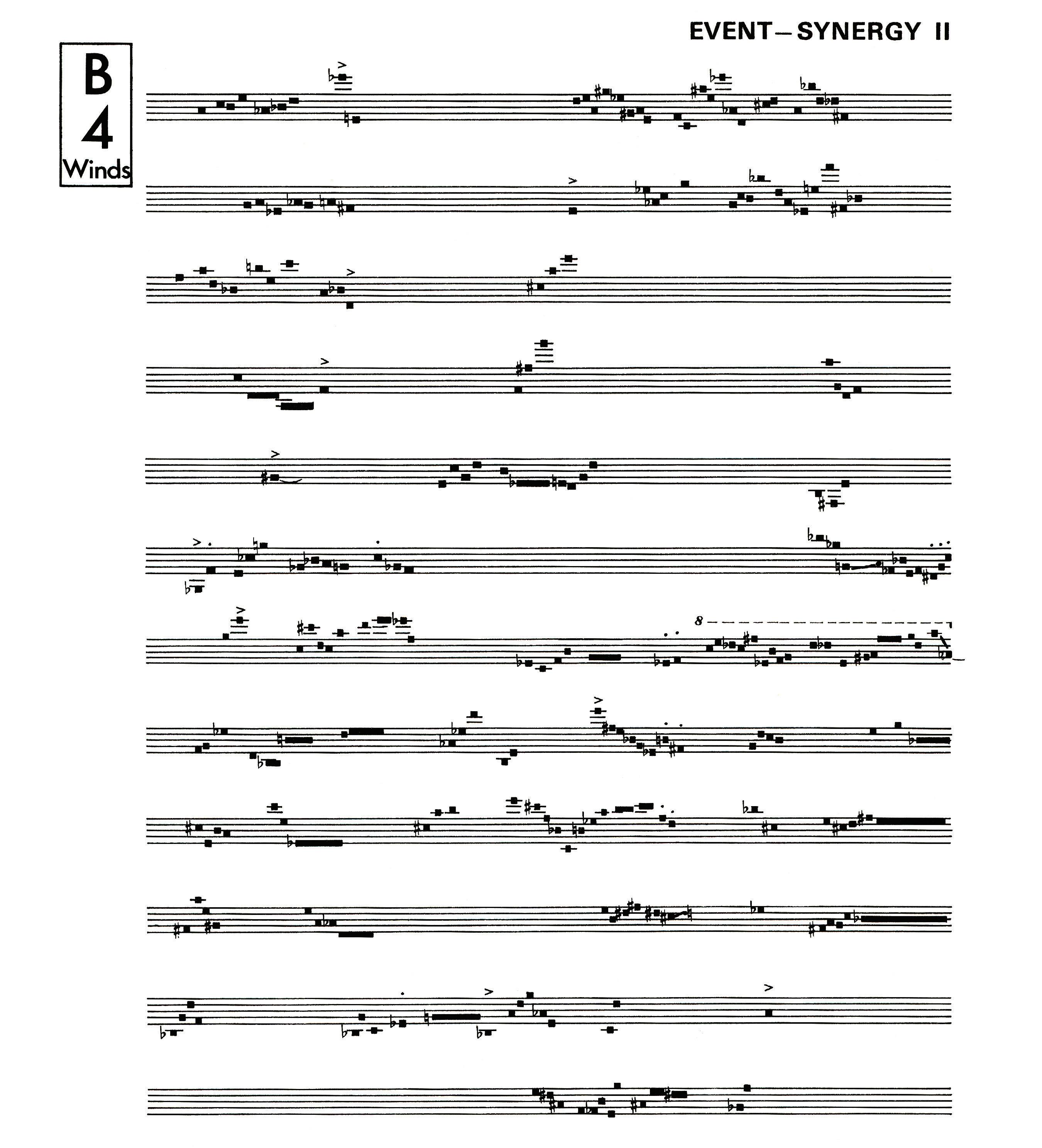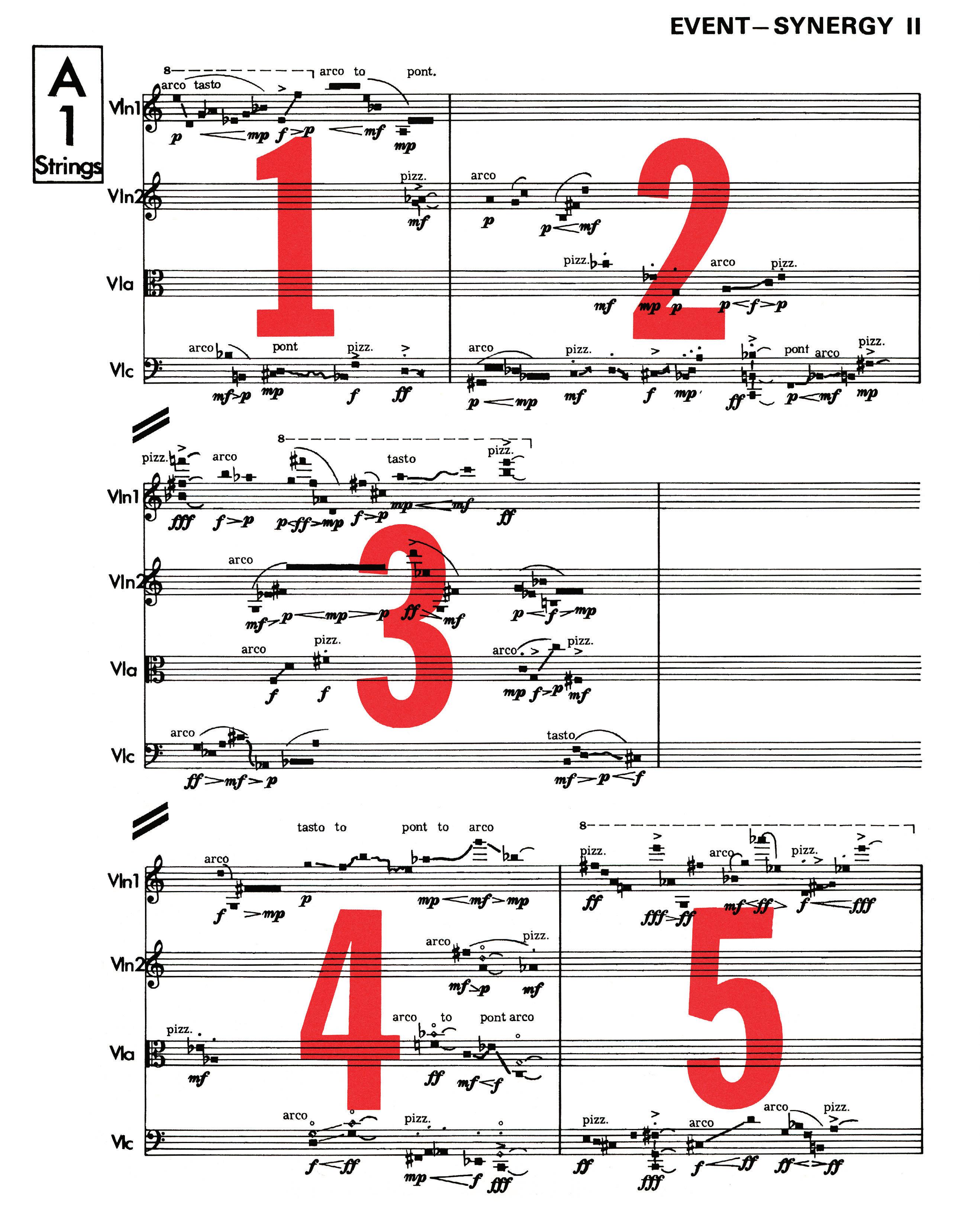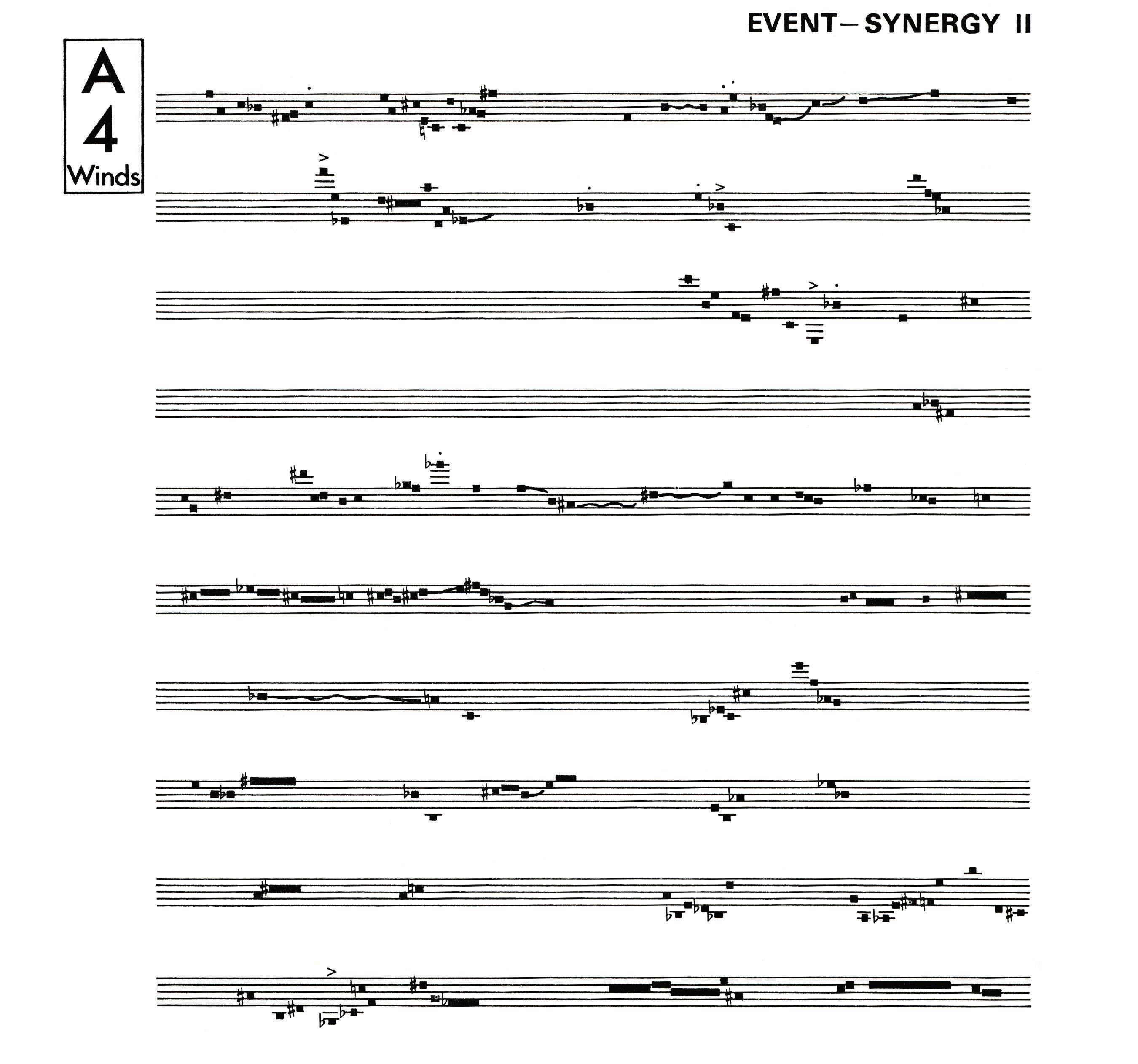 In SYNERGY II I have increased the degree of control which the conductor may have over the individuals and groups within the orchestra and over-all form. Also, because of the opportunity of writing for the fine musicians of the Domaine Musical, I have increased the degree of self-determination of sound details by the musicians themselves in