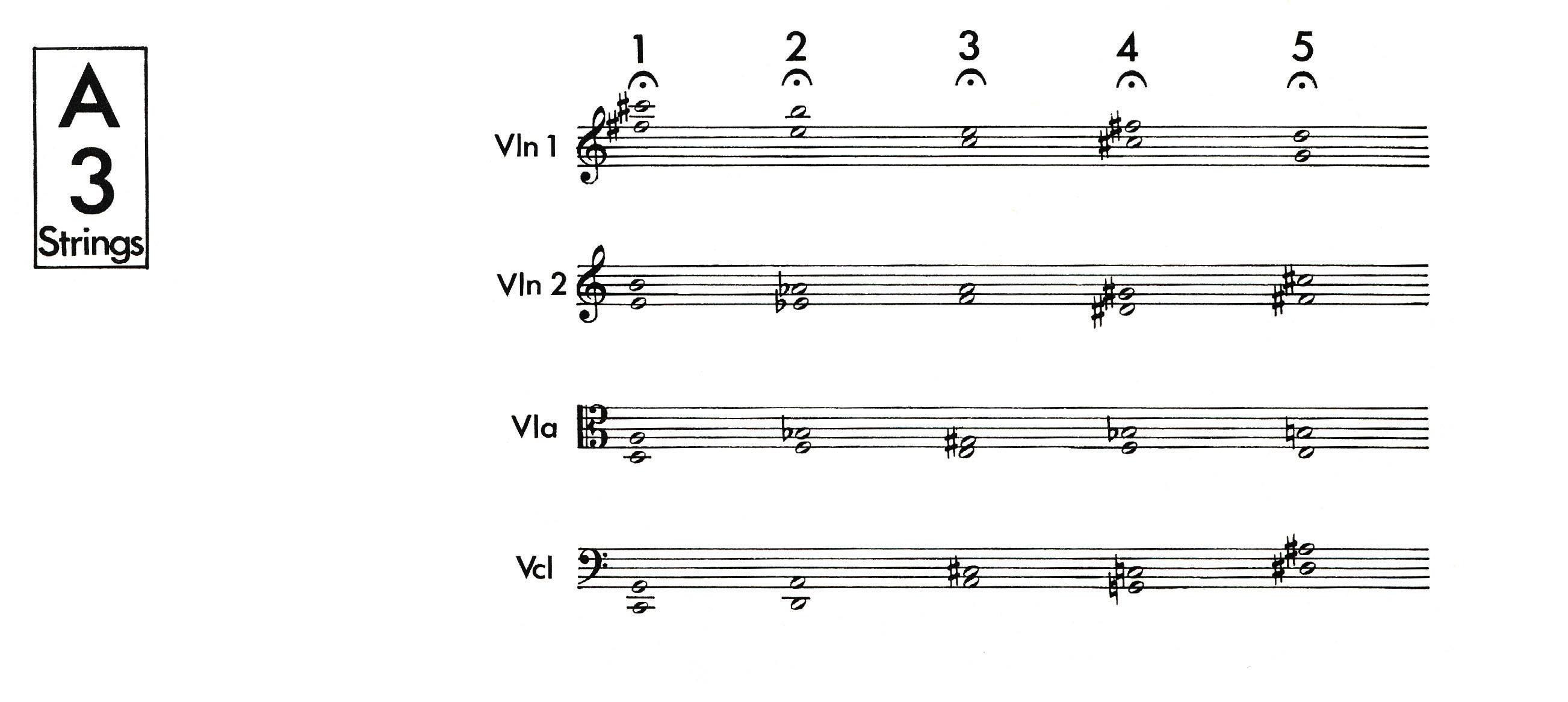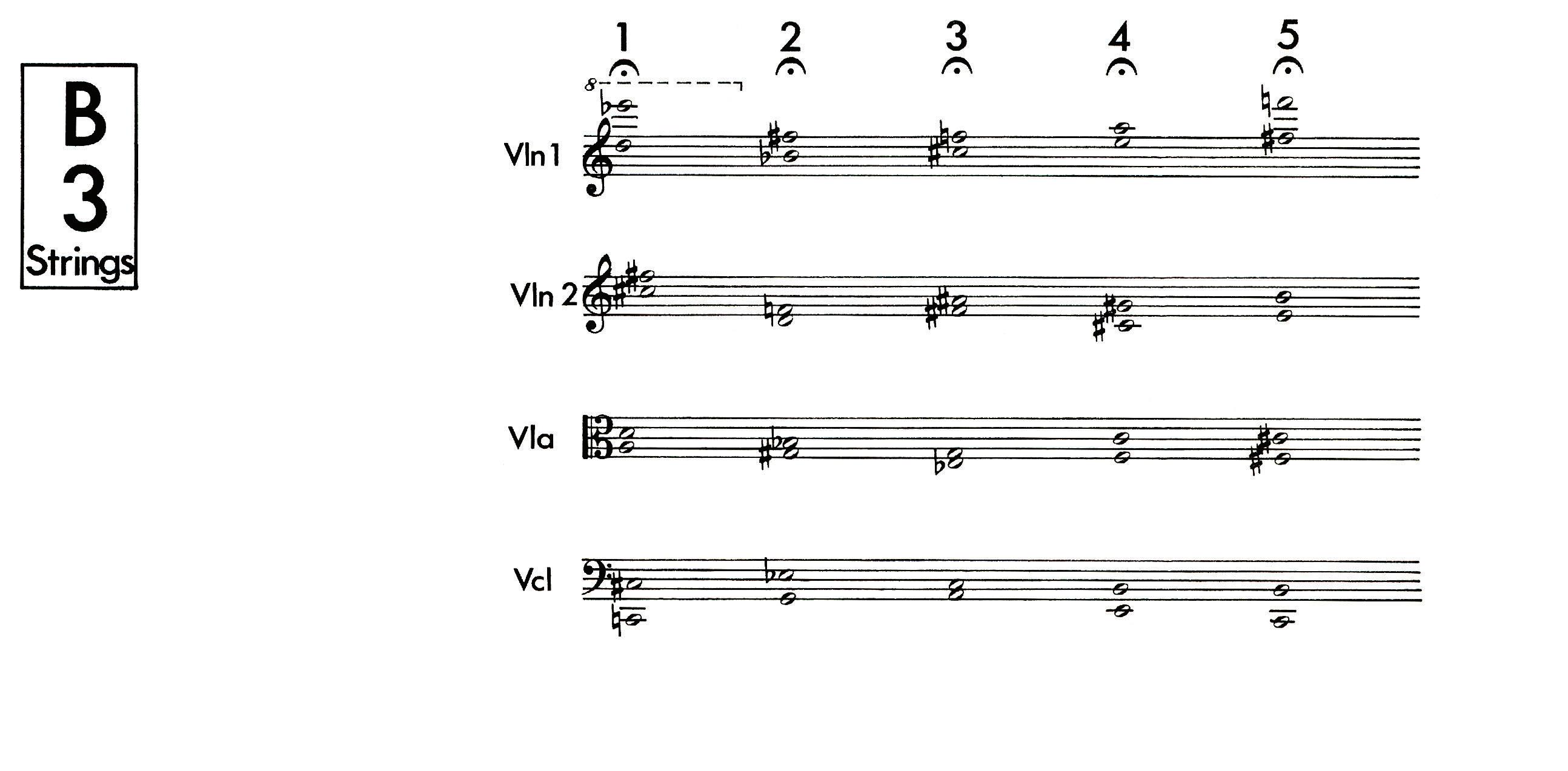 There are five fermata chords each for the winds and strings They may be conducted (as indicated by the fingers of the left hand) in any sequence and at any speed that the musicians (with rehearsal) can comfortably follow and perform. The winds and strings do not, of course, have to perform the same numbered chords at the same time. Each chord is held ( ) until the conductor either stops it or gives another chord for the musicians to move to. Conductor must always prepare the musicians for the chord he wishes with left-hand number indication and down-beat with right.