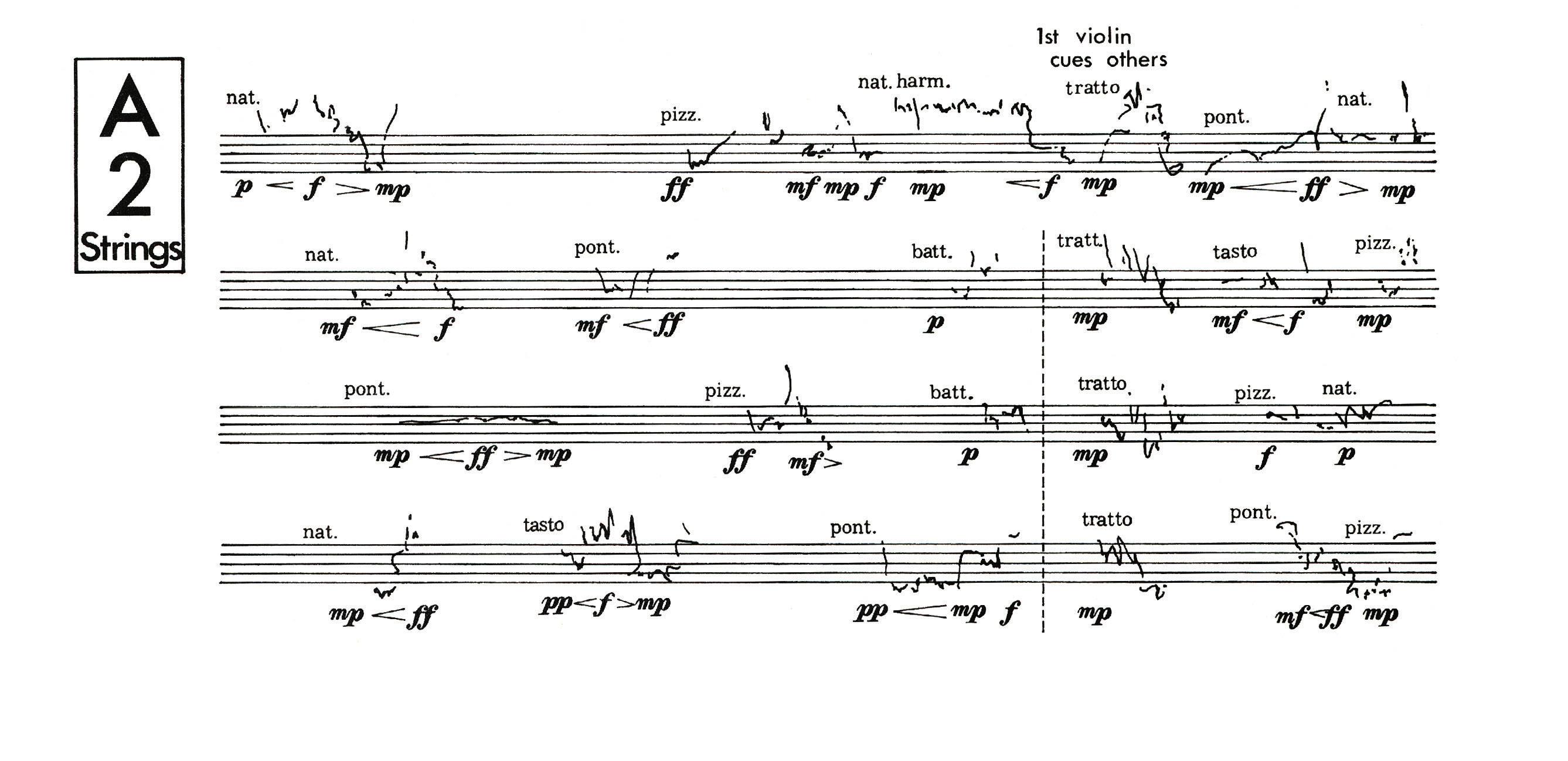 STRINGS : this material is basically a graphically notated ensemble * string-quartet passage. The first time that this page is conducted in each performance it is to be performed by the string quartet as an ensemble Subsequently the conductor may give the cue for the material to be performed as an ensemble passage (as the first time the material is used) or he may give personal cues to individual members of the quartet who then perform their individual lines soloistically