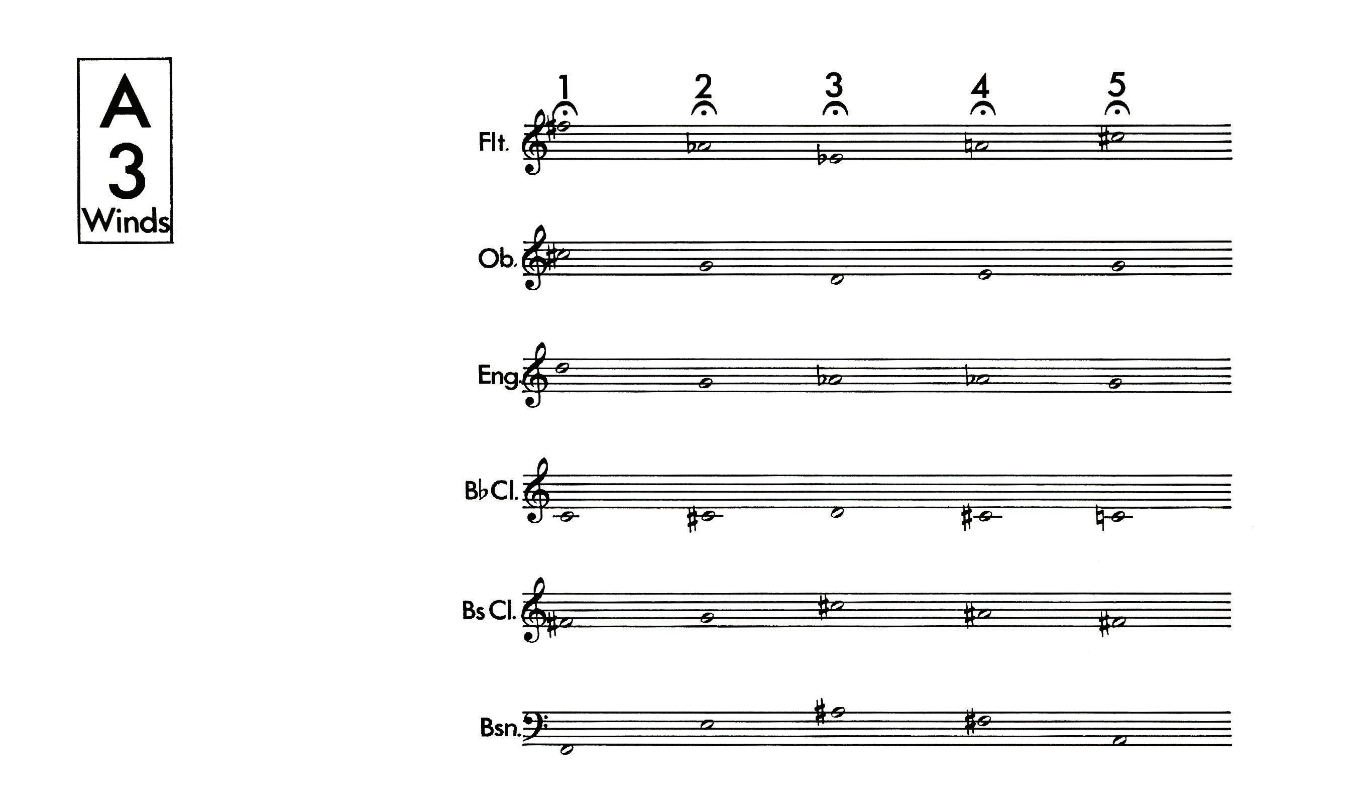 There are five fermata chords each for the winds and strings. They may be conducted (as indicated by the fingers of the left hand) in any sequence and at any speed that the musicians (with rehearsal) can comfortably follow and perform. The winds and strings do not, of course, have to perform the same numbered chords at the same time. Each chord is held ( ) until the conductor either stops it or gives another chord for the musicians to move to. The conductor must always prepare the musicians for the chord he wishes with left-hand number indication and down-beat with right.