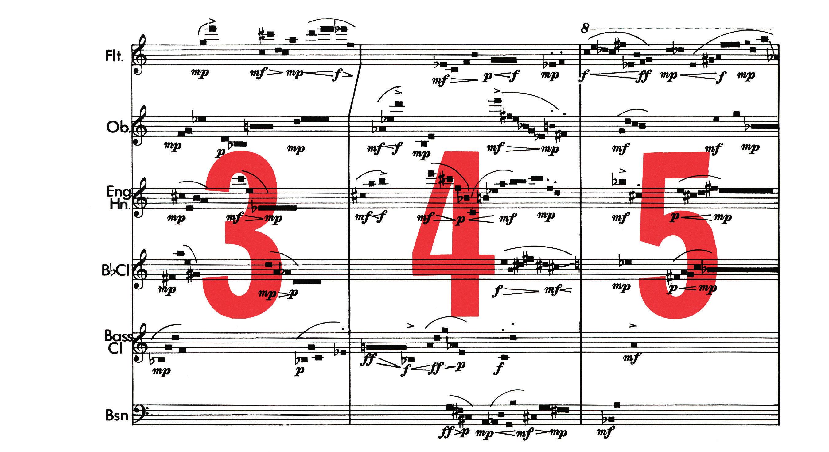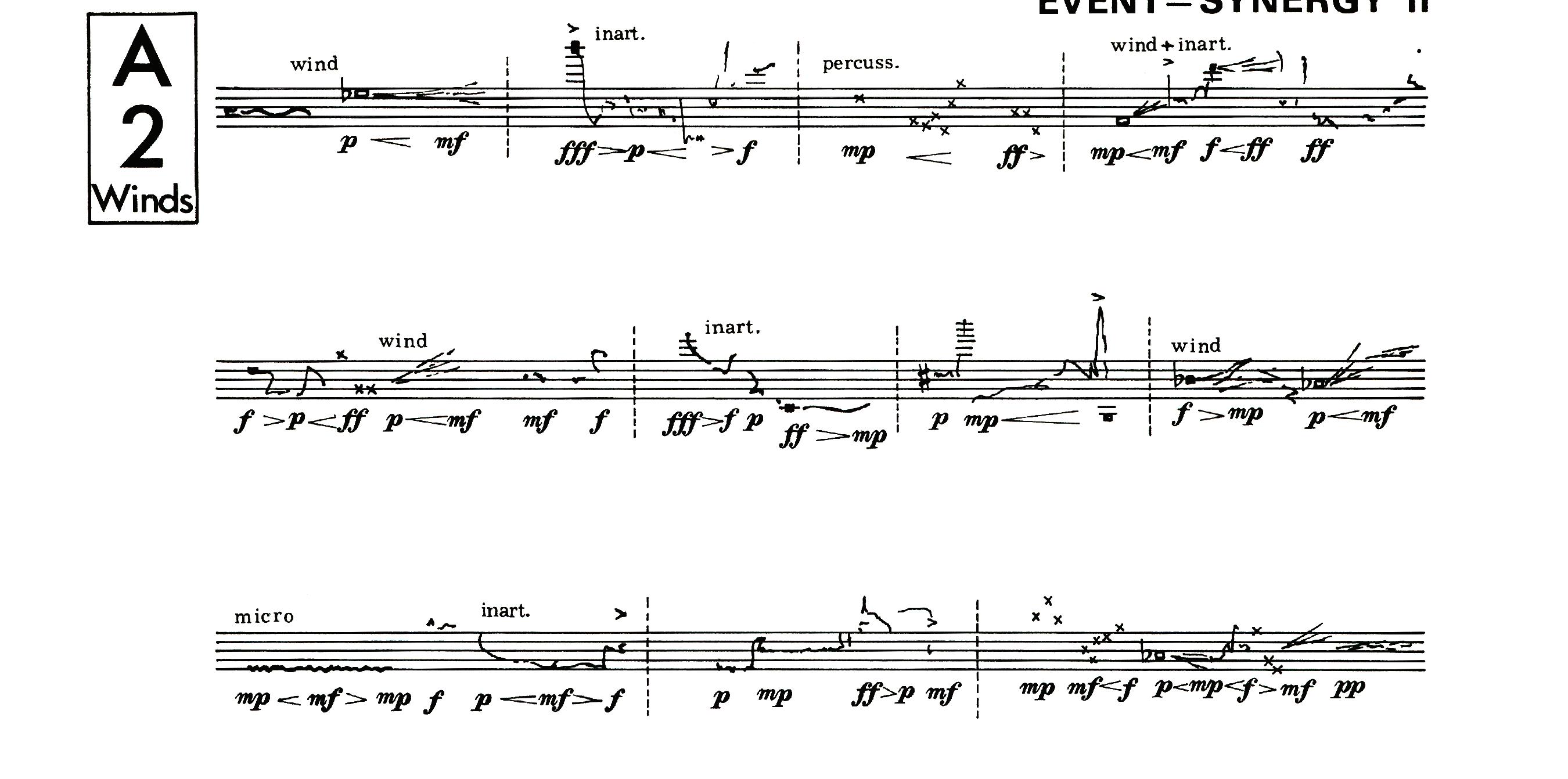 There are five events for winds and five for strings. The notation is highly specific as to pitch and dynamics; phrasing and duration are proportionally notated, as is the vertical relationship between instruments. (Each instrument sees its relationship to all others!)
