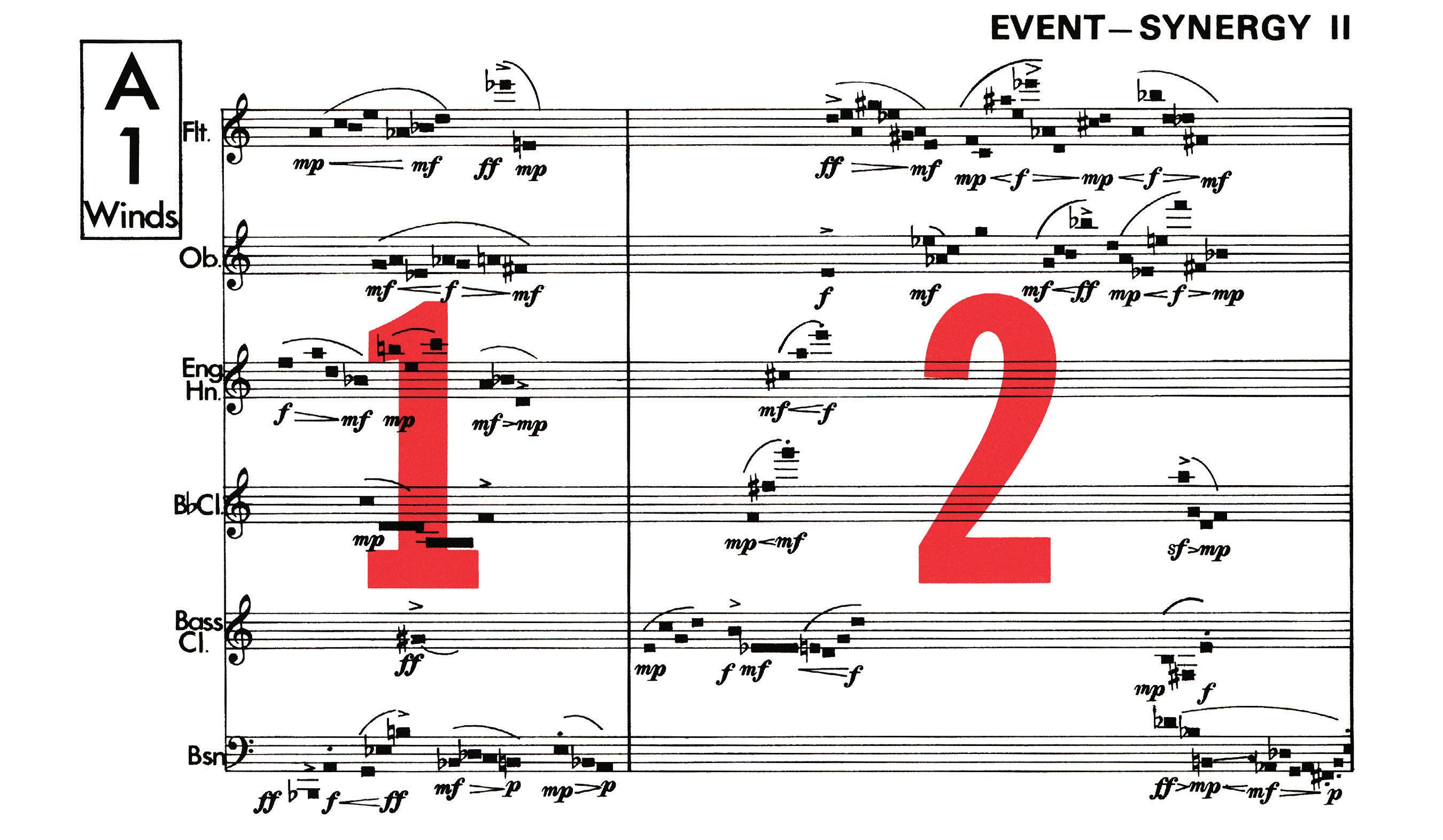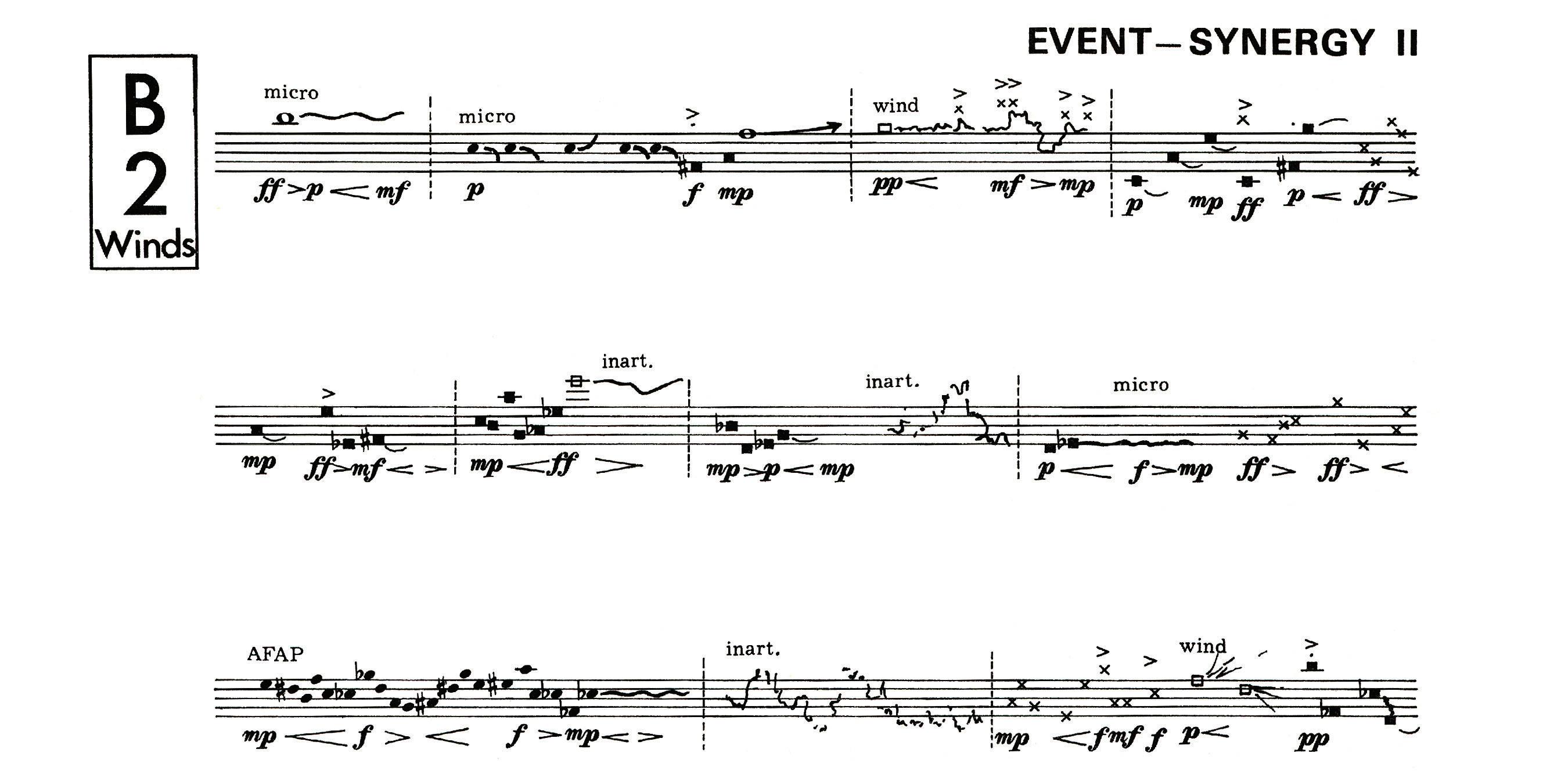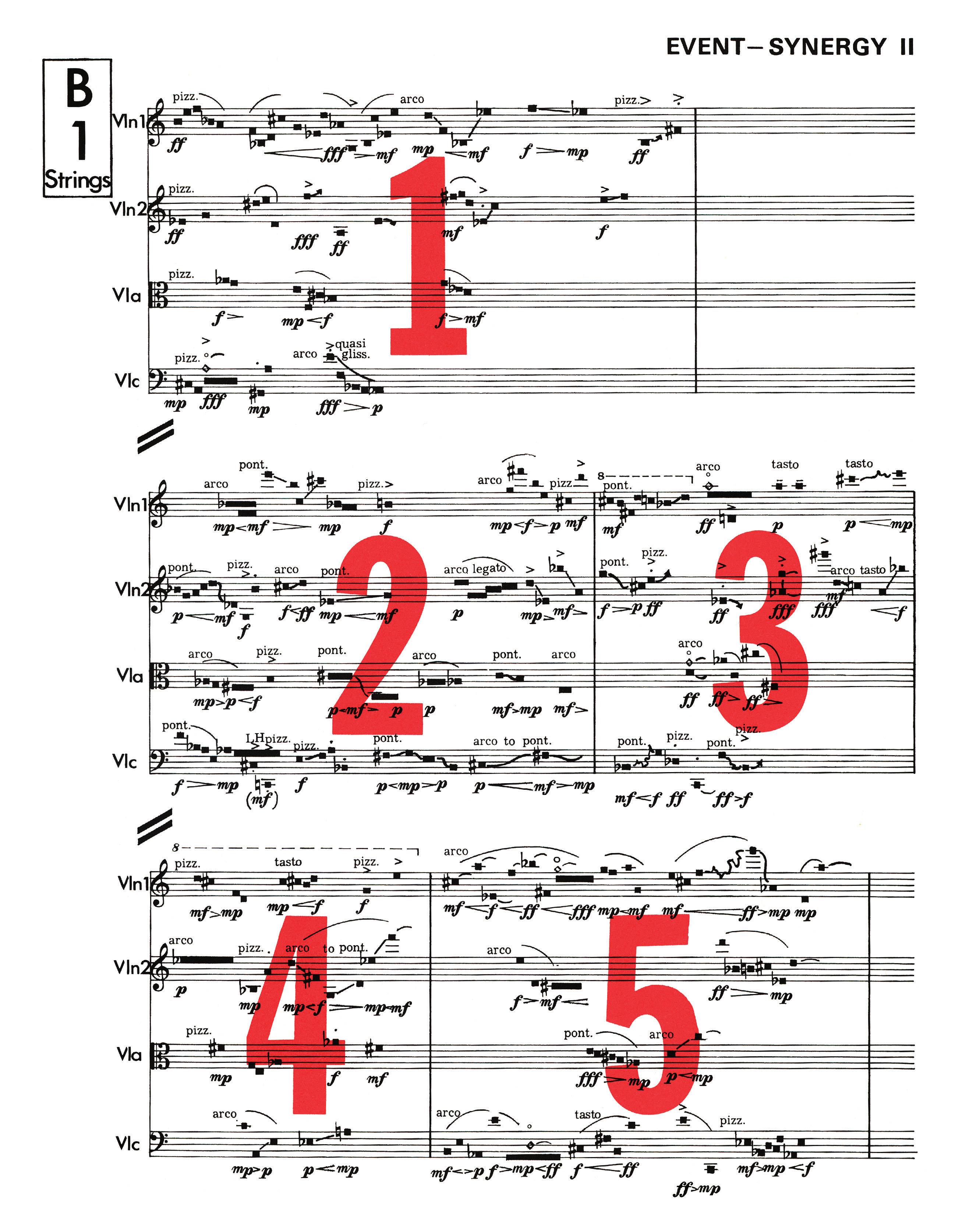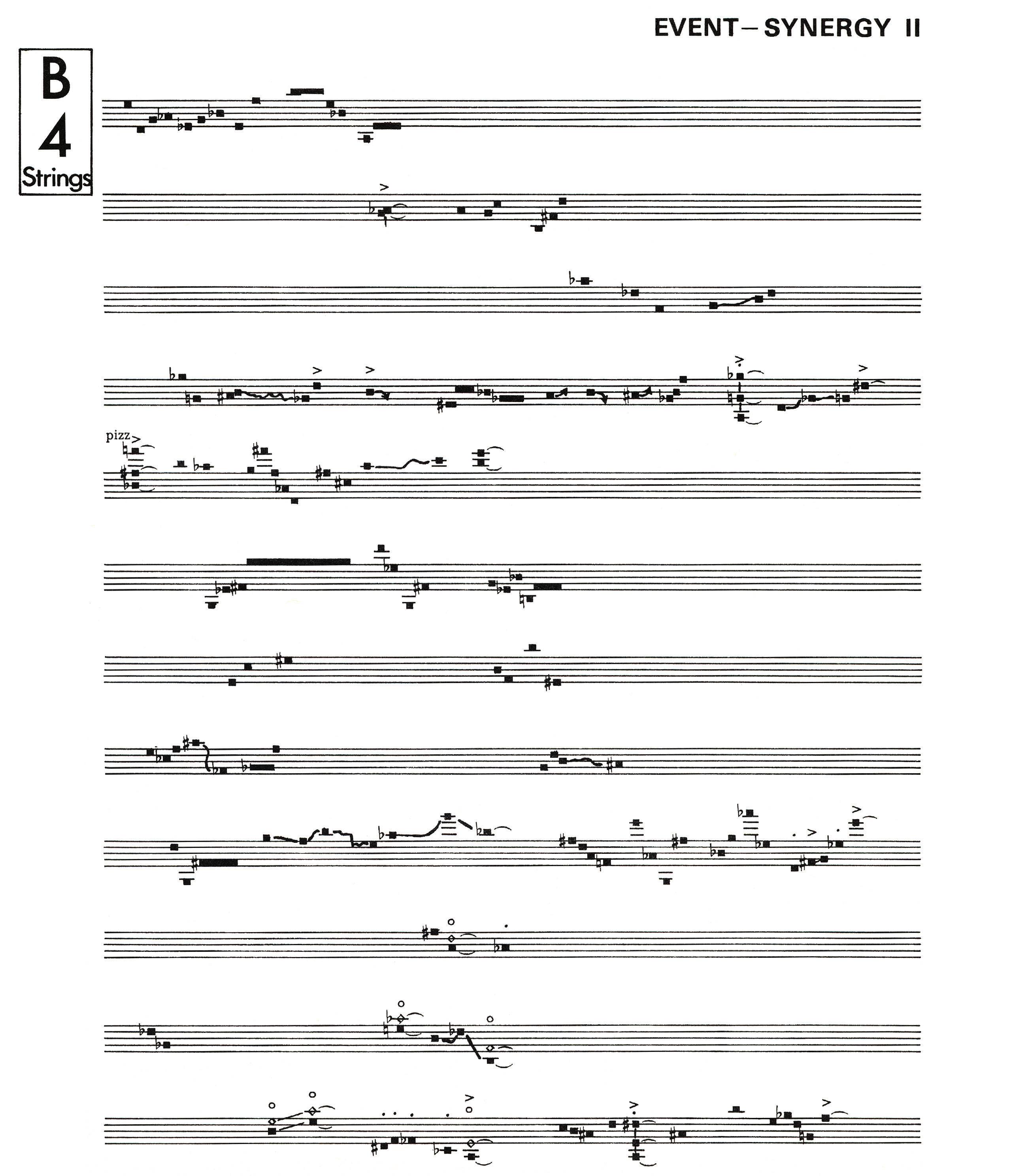 There are five events for winds and five for strings. The notation is highly specific as to pitch and dynamics; phrasing and duration are proportionally notated, as is the vertical relationship between instruments. (Each instrument sees its relationship to all others!) These events must be very carefully rehearsed until performed extremely accurately as to content and shape. In performance they may be conducted in any sequence and in any superimposition of strings and winds. The tempo and overall loudness of each event may be varied each time it is performed, and may be called for by the conductor any number of times (see General Modifications of Events).