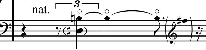 3. Contrabass part and score, rehearsal number 14, bar 7, the harmonic should be: