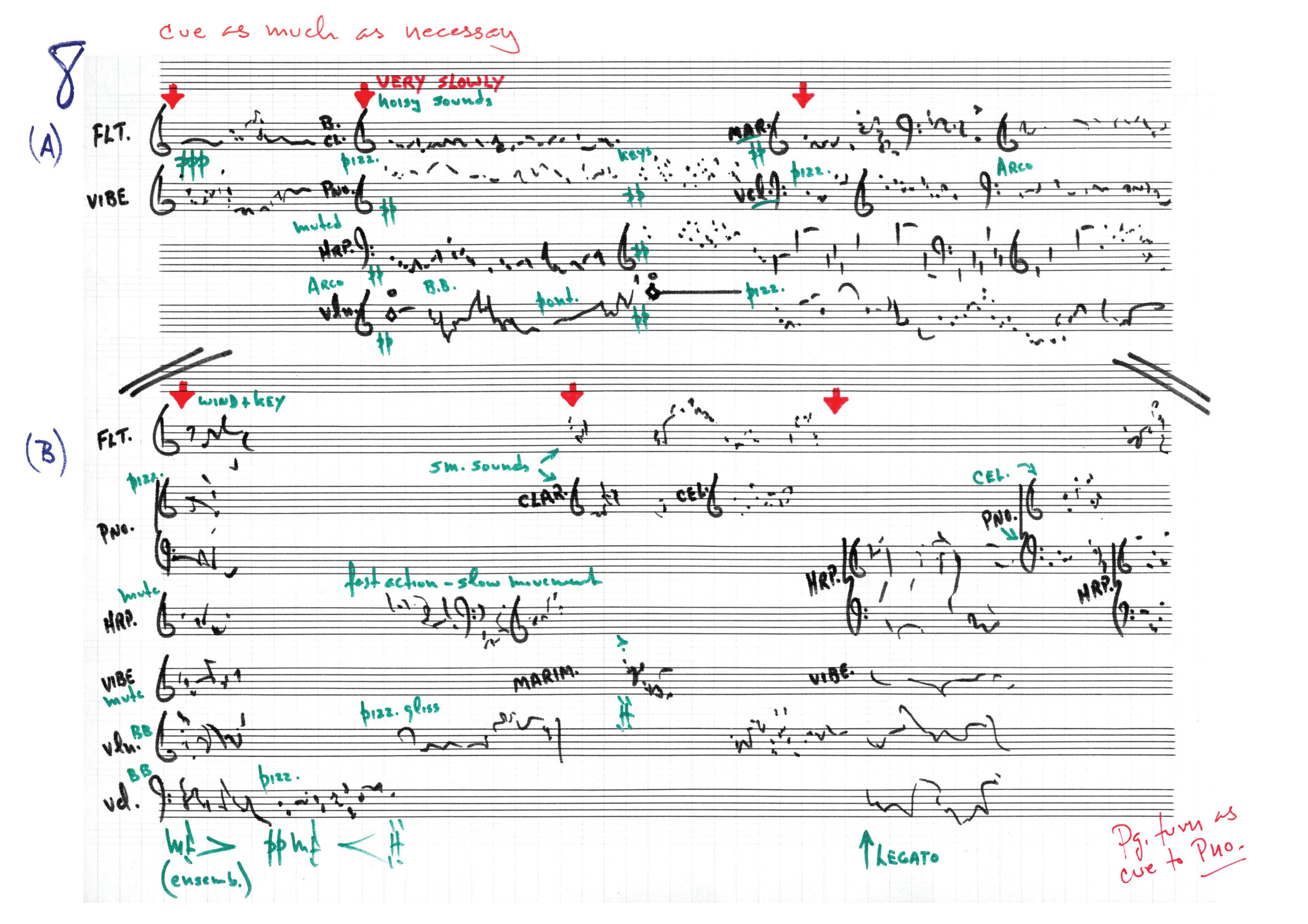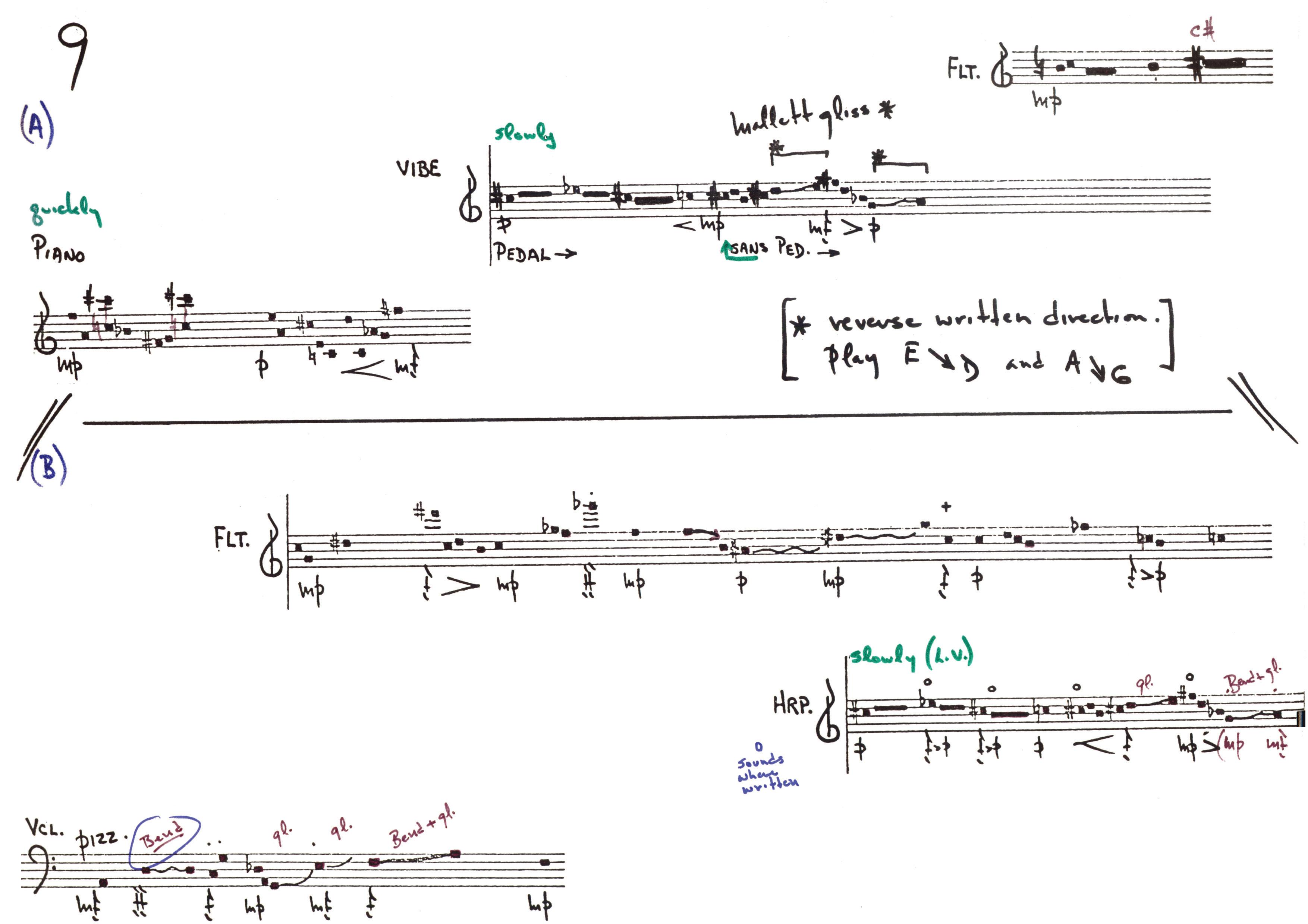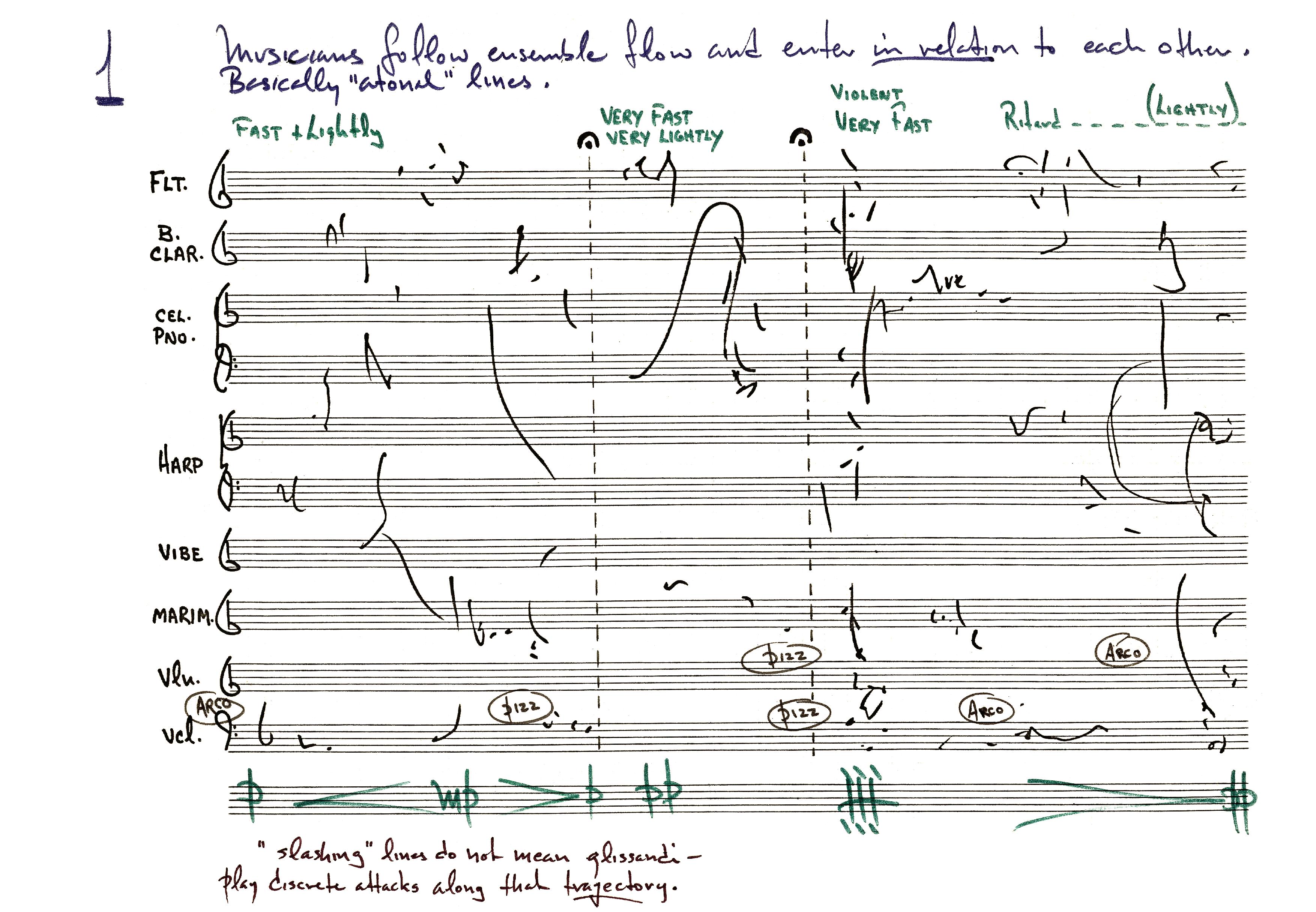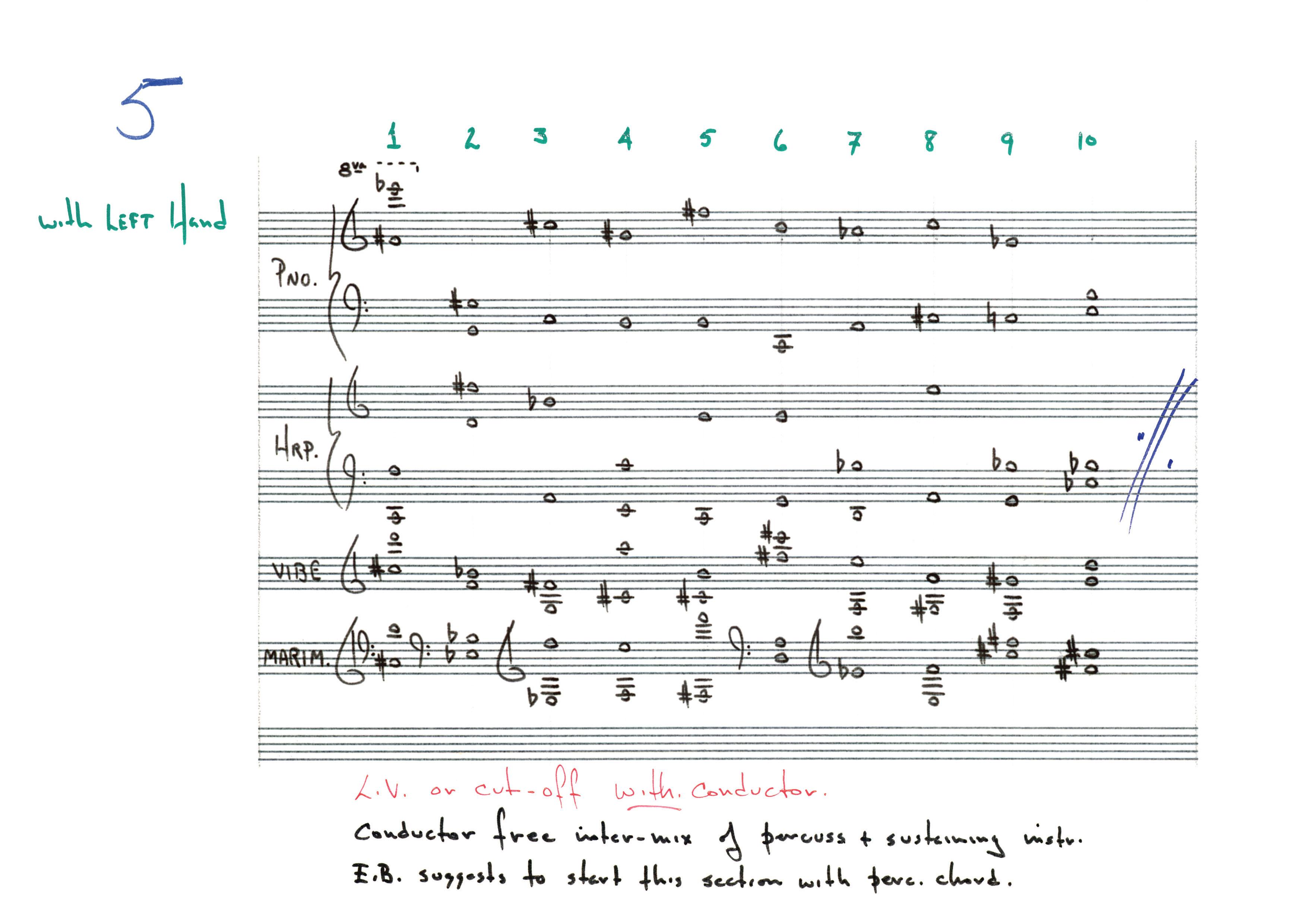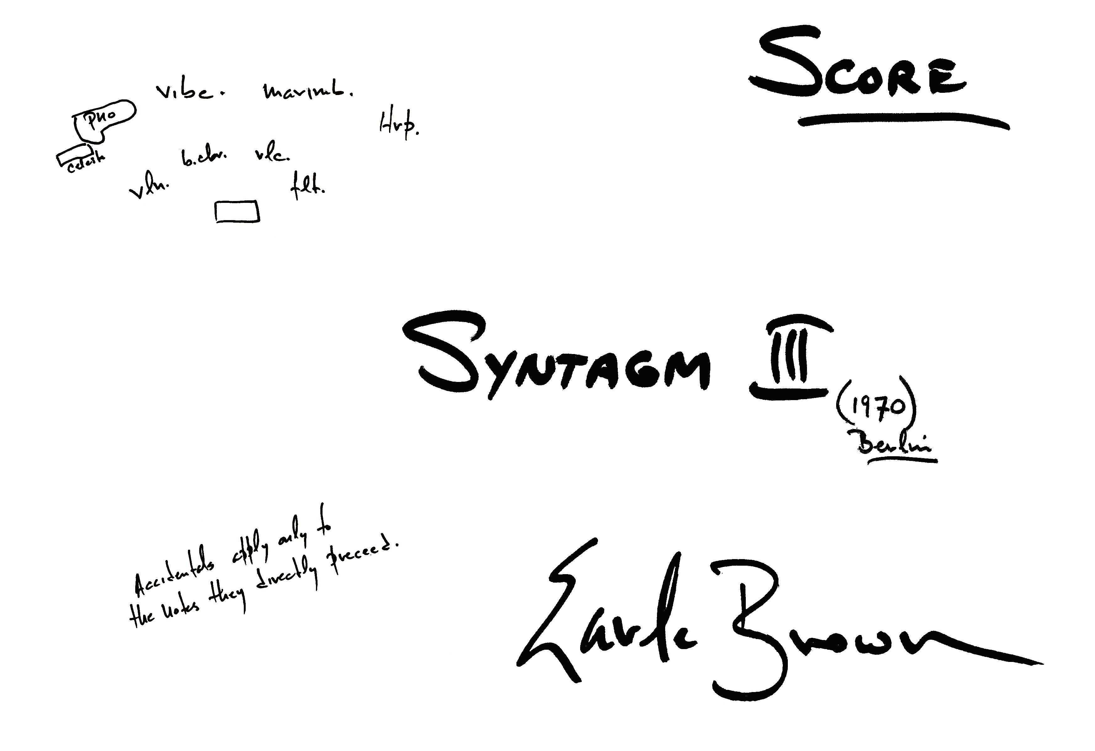SYNTAGM III is an extension of my early graphic, improvisational scores such as SYNERGY I and DECEMBER 1952 [both from FOLIO ( 1954 )] in combination with aspects of open form ( TWENTY-FIVE PAGES ( 1953 )) and more recent scores such as SYNERGY II in which I have combined all of these “experimental” scoring and performance techniques. SYNTAGM III is a further attempt to create relevant and responsible aspects of my function as a composer and an optimistic attitude toward performance spontaneity . . a kind of “programmed environment” of composer-performance collaboration. This is very close to the definition of “synergy” as I worked with the concept in 1952 . Recent developments are encouraging, finally.