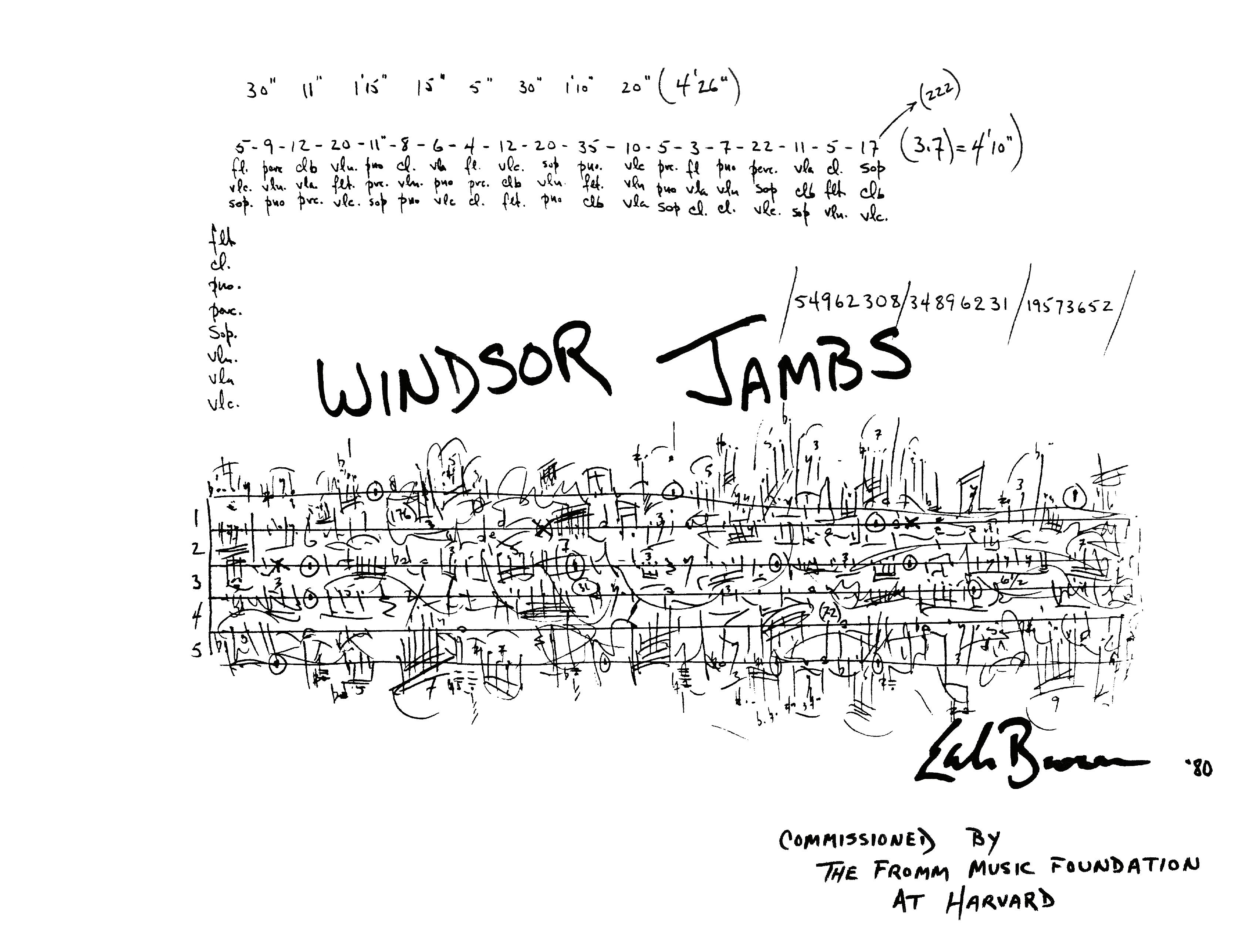 The title, WINDSOR JAMBS comes from a road sign I saw somewhere in Connecticut or Western Massachusetts a few years ago. I liked the sound of it as a title and i t has come to express somewhat the polyphonic juxtapositions an d interweaving of melodic materials that occur in the work.