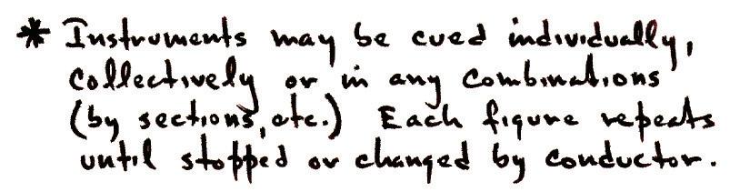The conception of the work is that the score presents specific material having different characteristics, an d that this material is subject to many inherent modifications, such as modifications of combinations (event plus e vent), sequences, dynamics, and tempos, spontaneously created during the performance. All events are always prepared by a left-hand signal and initiated by a down-beat from the conductor; the size and rapidity of the down-beat implies the loudness and speed with which the event is to be performed. The conductor must, as with any notation insist on accurately articulated relationships from the rhythmic “shape” of phrase and pitch sequences in this work.