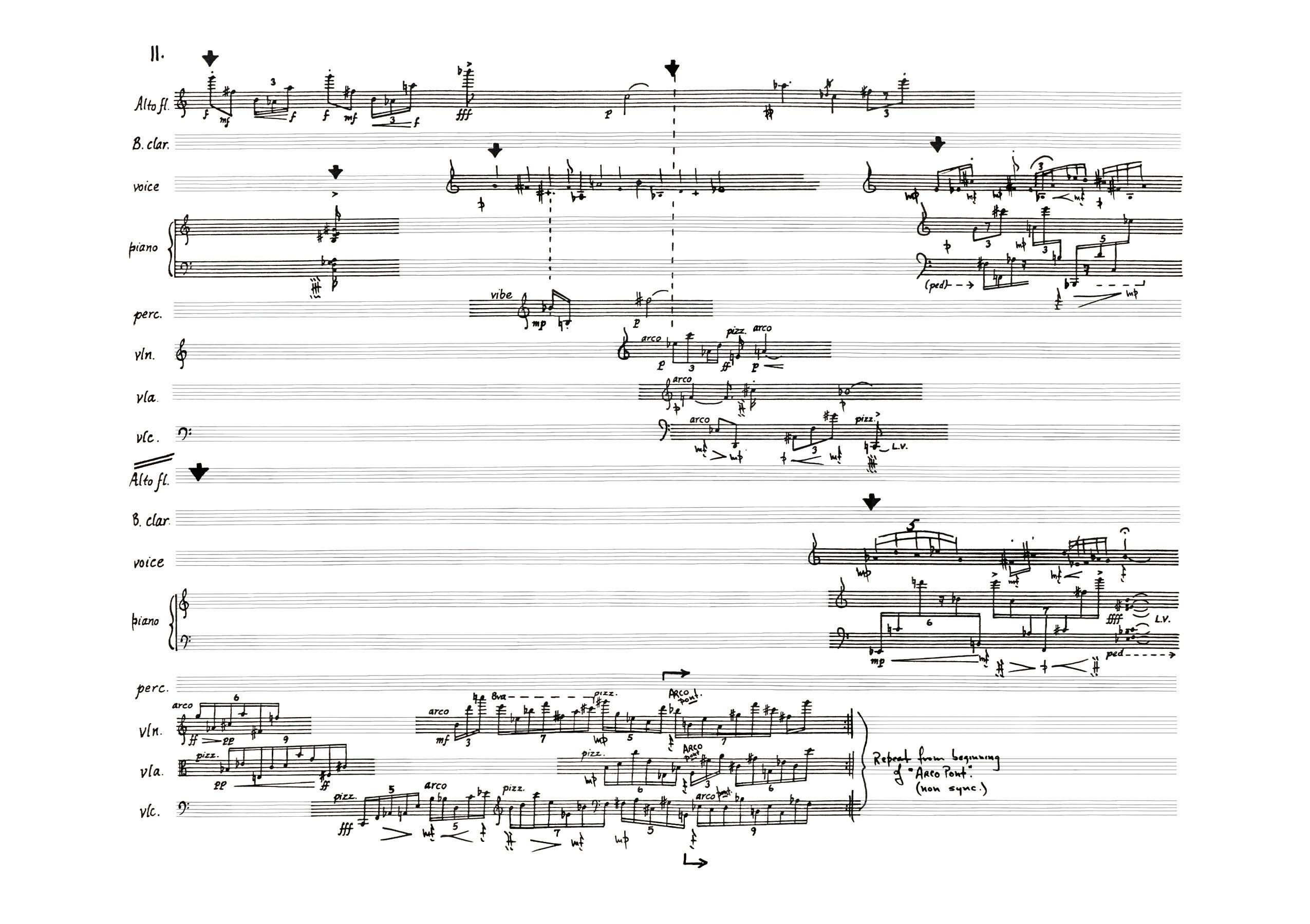 The essential “poetics” of the work, for me, were in creating the warm rich sounds of voice, flute, and clarinet in relation to the more “classic” string trio sound and the per cussive nature of the piano, vibraphone and marimba. The composition is really “about” these instrumental characteristics and their potentials of being highly individualistic (soloistic) as well as becoming again an equal but essential element wi thin the orchestral sound texture.