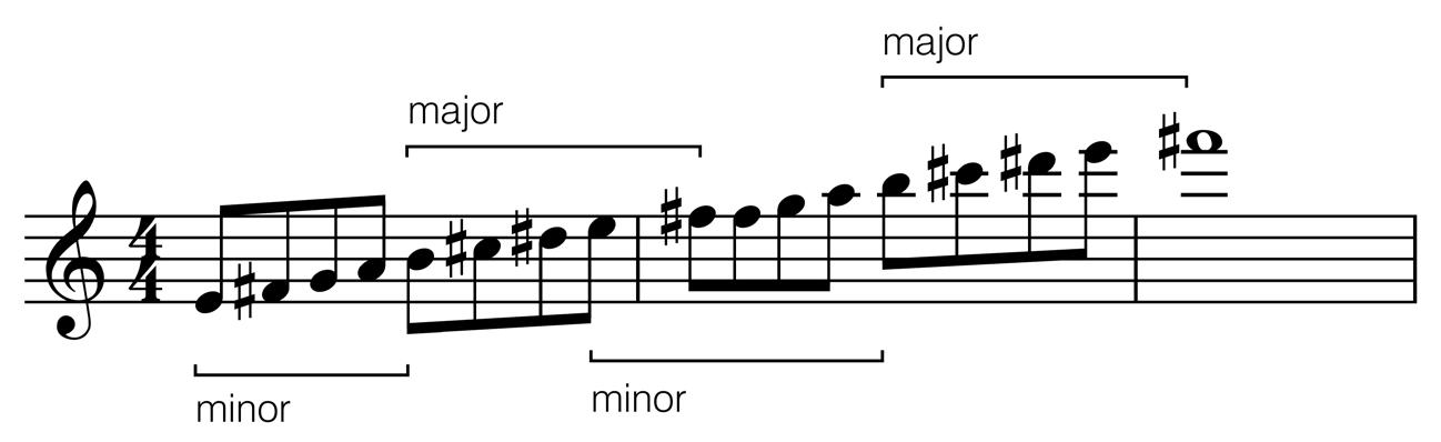 This is designed to conjure an atmosphere of calm mystery – Saturn’s rings perhaps representing the cloaking of detail. The first half of the scale is minor in quality and the second half of the scale is major in quality. This does not constitute bitonality exactly, but it creates an aural atmosphere of ambiguity.