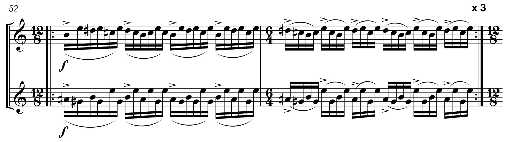 This was further refined into a rhythmic structure built around a cycle of three bars of 4/4 followed by a bar of 2/4 (28 quavers in all):
