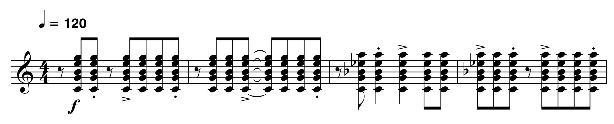 The entry of guitar 1 at bar 5, locks into the same rhythmic cycle as guitar 2 but adding additional diatonic cluster tones, the only note missing being the 6th degree (A or Ab) from the first chord: