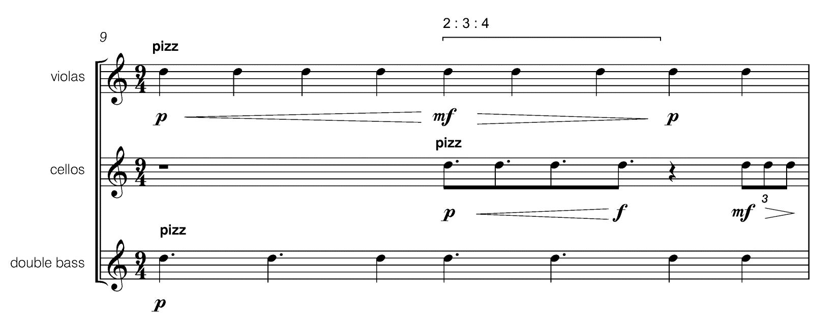 Orchestral commissions typically specify the type and number of instruments that will be available to the composer. This particular brief was for a chamber orchestra of around 20 musicians. Aaron Copland’s Appalachian Spring was mentioned as a reference point, and from this, I adopted the same string section (4 violins, 2 violas, 2 cellos and 1 double bass). The double string quartet nature of this octet (plus bass) is essentially a chamber music combination (as opposed to a full orchestral string section), but it does invite complete divisi and is laid out in the score accordingly on 9 staves – one staff per instrument (as are the wind, brass and percussion sections).