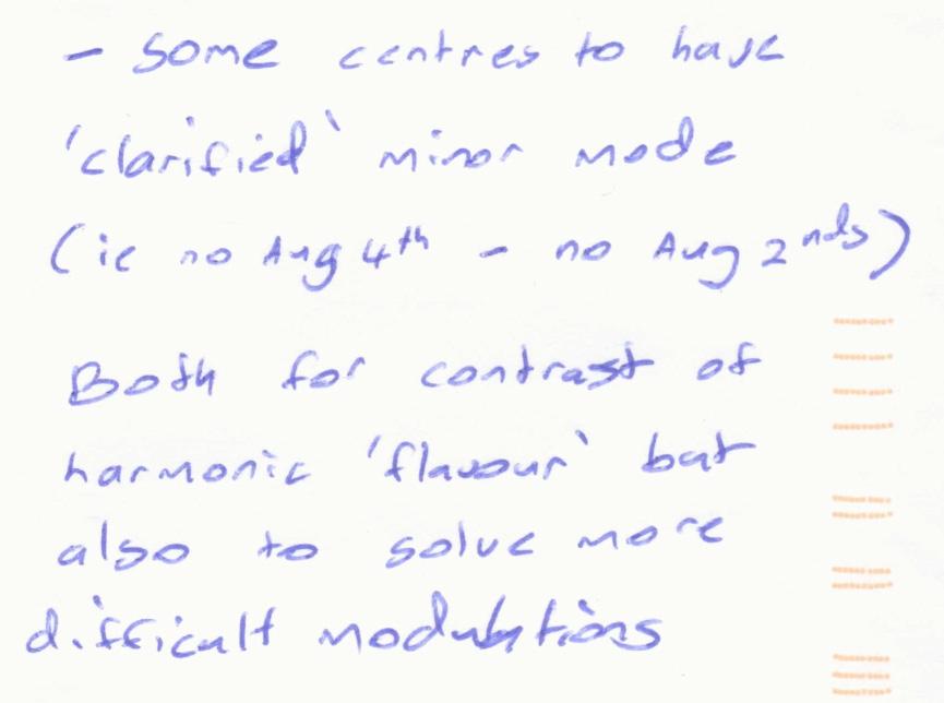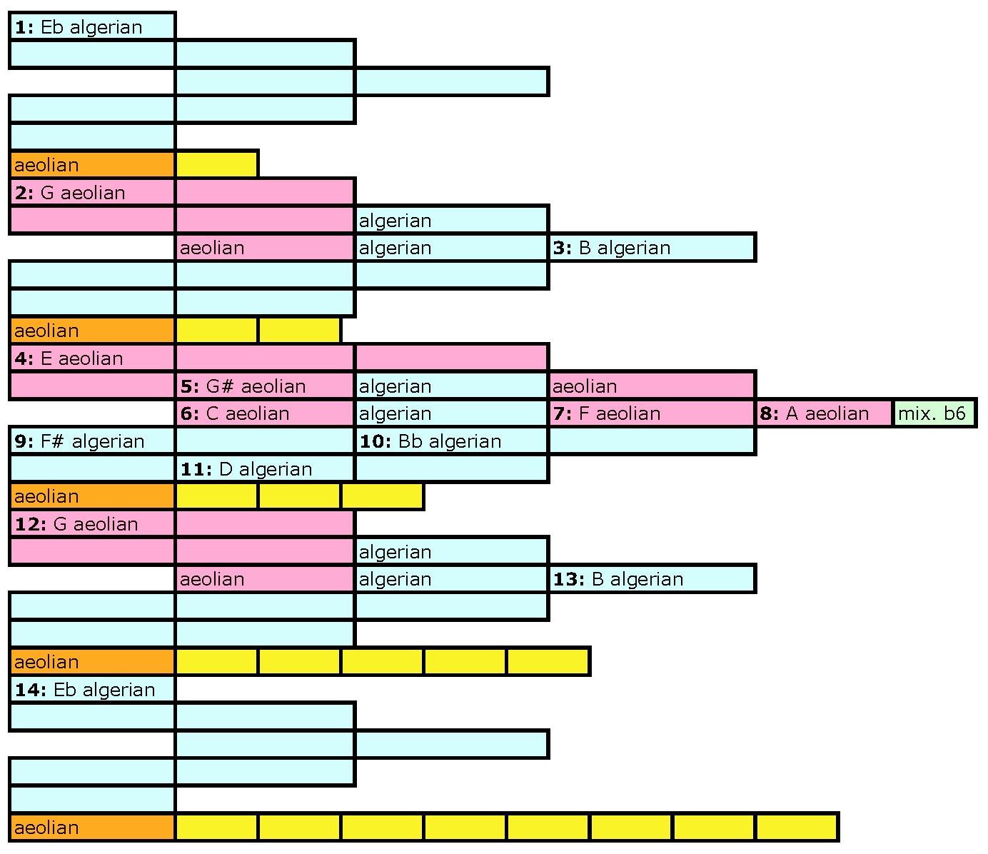 The result was that Perspectives 2, 3 & 4 were altered to make partial use of an Aeolian mode (marked in pink) as variation to the Algerian mode (marked in light blue):