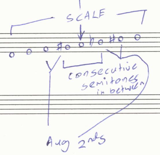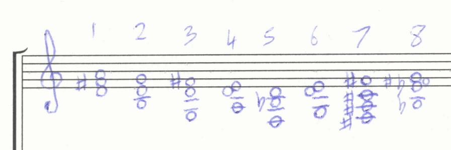 The arpeggio pattern above outlines major triads of Bb and A against a D bass (chords VI and V in D minor). It departs from standard tonal analysis with the introduction of G#. It is marked in brackets because I was still contemplating the ramifications of this ‘outside’ note. After writing it out as a scale, this became a little clearer: