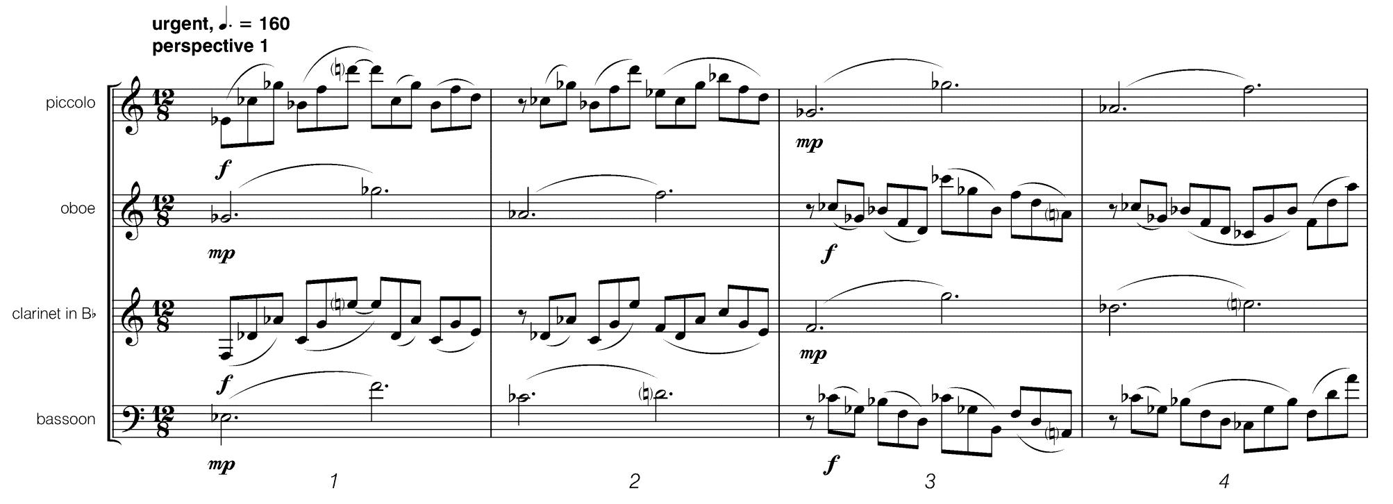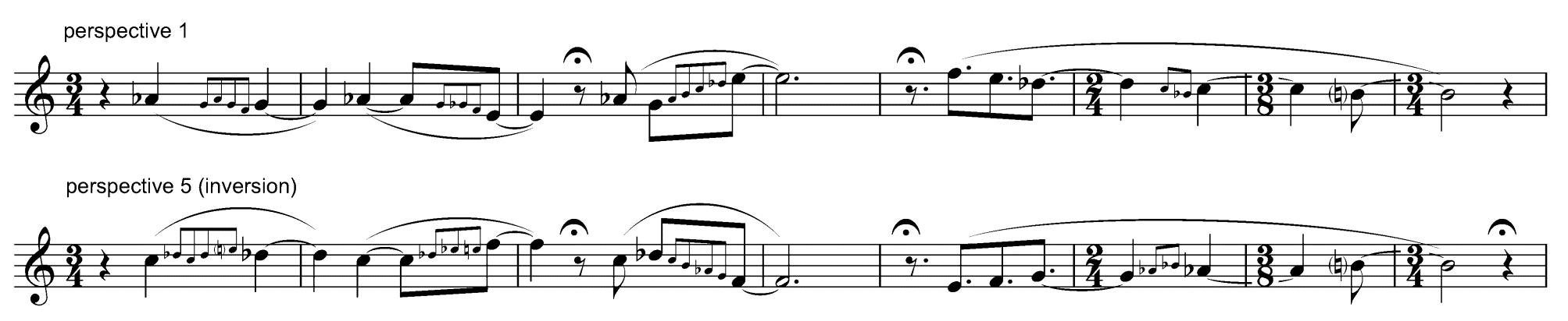 Overtly melodic lines were freely composed against the structured motivic flow, mostly within the Aeolian and Algerian scale alternations as outlined by the motivic flow. One of the influences for the approach to melody and texture was Lyle Mays, Street Dreams (part 3) which features particularly haunting cor anglais writing against an orchestral soundscape. Perspectives 4 and 5 mirror Perspectives 2 and 1 with the crucial difference that the cor anglais and flugel horn solos are inverted (using the central ‘B’ line of the staff as the mirror point):