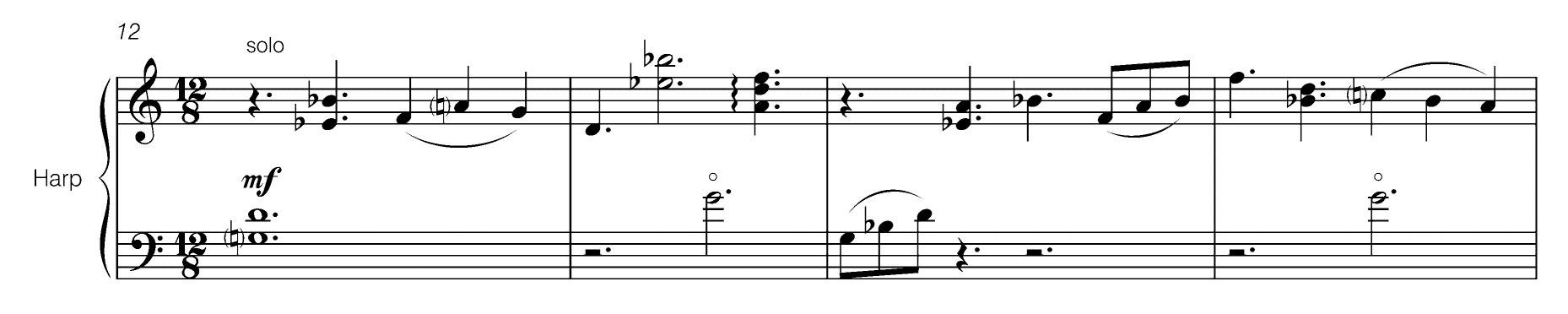 Subsequent textural variations (such as the harp solo at letter B) mix up quavers with crotchets (virtual triplets) and the regular pulse of dotted crotchets: