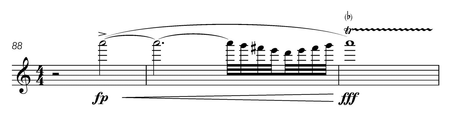 The harp and vibraphone dovetail a connected flow of semiquavers (chords as arpeggios) representing the pulsing of rapid–play mode. This second preview is scored almost exclusively above middle C. In theory, music played at 4 times the speed would also be exactly two octaves higher. This is an attractive concept in electro-acoustic terms, but not always practical in acoustic orchestration. Nonetheless, this movement represents an attempt at this ideal through high–register scoring and also through the exploitation of timbral devices such as brass mutes, which help to accentuate h igher partials in the harmonic spectrum.