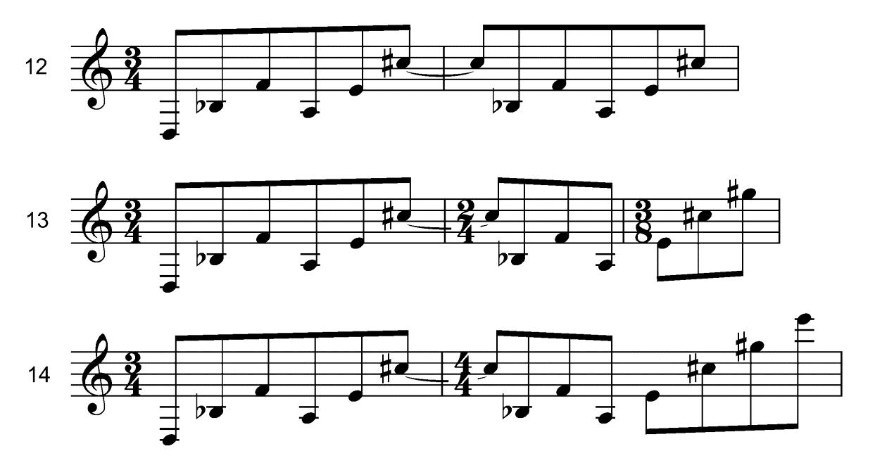 The solution to this problem lay in quantisation: the 13’s would lose a beat to become 12’s and the 14’s would add a beat to become 15’s. 12 and 15 are both divisible by 3 and able to carry the dotted crotchet pulse effectively. This slight readjustment allowed the music to ‘speak’ effectively at the faster tempo without losing the essential proportional relationship with the 2nd movement: