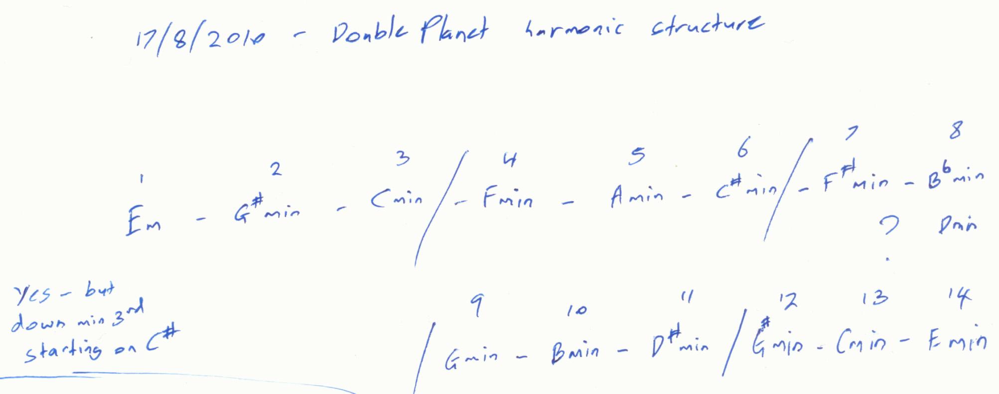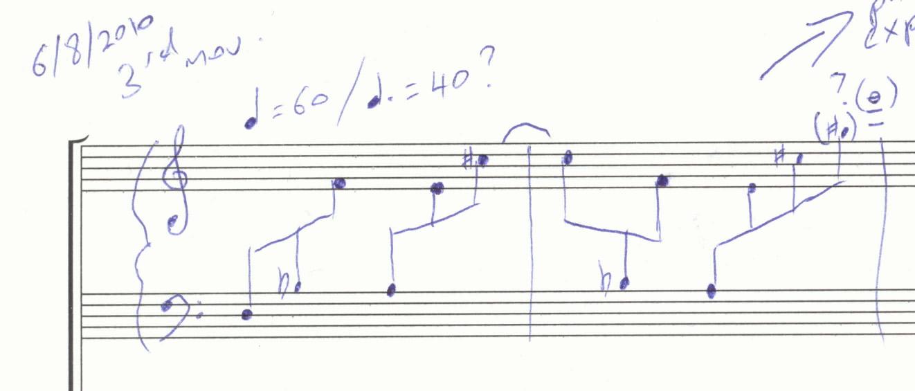 This sketch is from August 2010, though I had been playing this on and off for a few weeks before attempting to write it down in a specific way. It refers to the ‘3rd movement’ but Double Planet ultimately became the 2nd movement. I was originally playing this in 6/8 but decided on 3/4, in part to accommodate an overall tempo scheme for the 4 movements as follows: