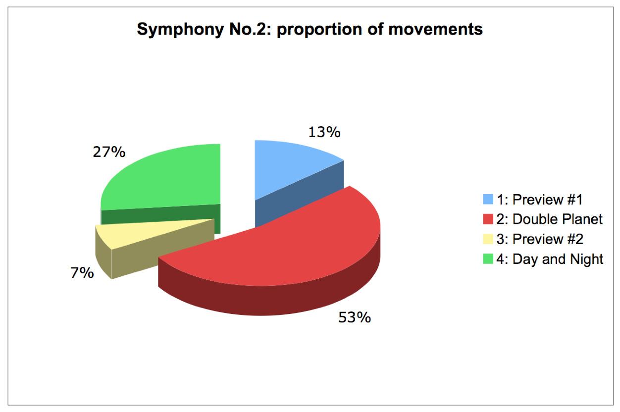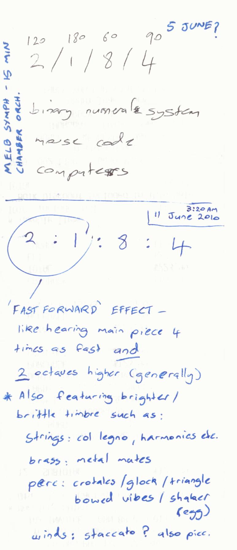 This impromptu sketch was made during a meeting with Katherine Kereszi (Melbourne Symphony Orchestra) in May 2010 at a café in Southbank. After briefly considering a 10+5 minute structure, the idea of binary multiplication (1+2+4+8) then lead to a re-ordering of this to 2+1+8+4 (and ultimately 2+8+1+4). Shown as a pie-chart, this reveals the 2nd movement as constituting over half the total duration of the piece: