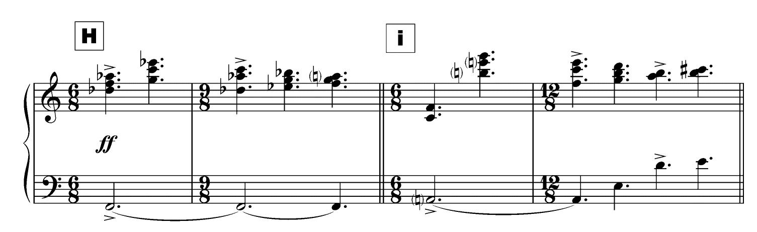 Metrically this is a pure arch form but harmonically the 8 chords are morphing from consonance to dissonance as they do in the final movement (but at 4 times the speed).