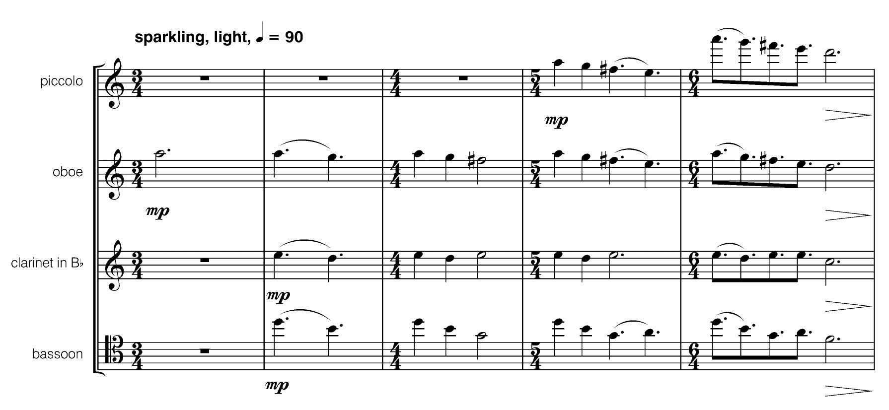 Whereas the 4th movement, Day and Night is scored exclusively in 4/4, Preview #2 converts the number of 4/4 bars into a single time signature that expands from 3/4 up to 9/4 and back to 3/4 again:
