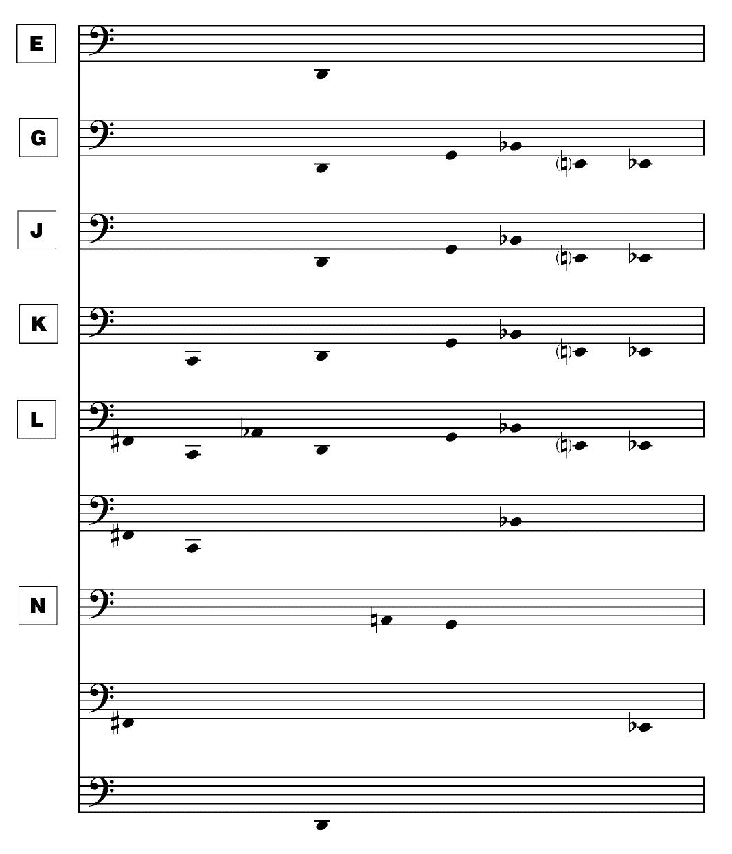 The final movement is overtly centred around the note ‘D’, but halfway through letter G, a progressive moving bass line develops, initially adding notes G, Bb, E and Eb, and then later on more notes still. The technique of tritone bass motion is featured in Debussy-esque fashion – a technique I first noticed as a 17–year–old studying La Mer (1905) and later also found in Steve Reich’s The Desert Music (1984). This paradigmatic chart reads like a book (left to right / top to bottom) and shows how the bass line develops: