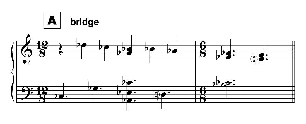 The bridge section acts as a metrical gear change out of the quaver flow and into a hemiola feel of crotchets against dotted crotchets. The first 12/8 bar (Ex.40) equates to two bars of 3/4 from the 3rd movement (Ex.41):