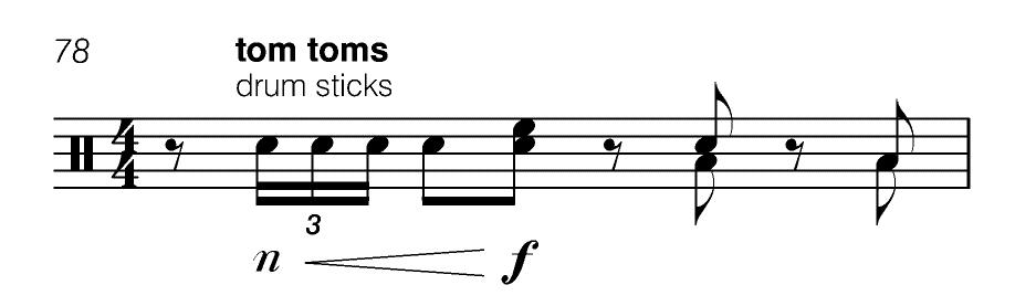 The shuffle feel that is established at letter H was in part influenced by two particular pop songs: Rosanna (1982) by Toto – crotchet = 84; and Let There Be Love (1991) by Simple Minds – crotchet = 88. I didn’t listen to these songs at the time of writing but my memory of them was influential. Referring back to them now, I can see that the triple shuffle feel is slightly slower in these songs (than the 4th movement tempo of crotchet = 90), and the tom tom figuration is more through-composed than a standard shuffle pattern, but there is a connection, nonetheless.