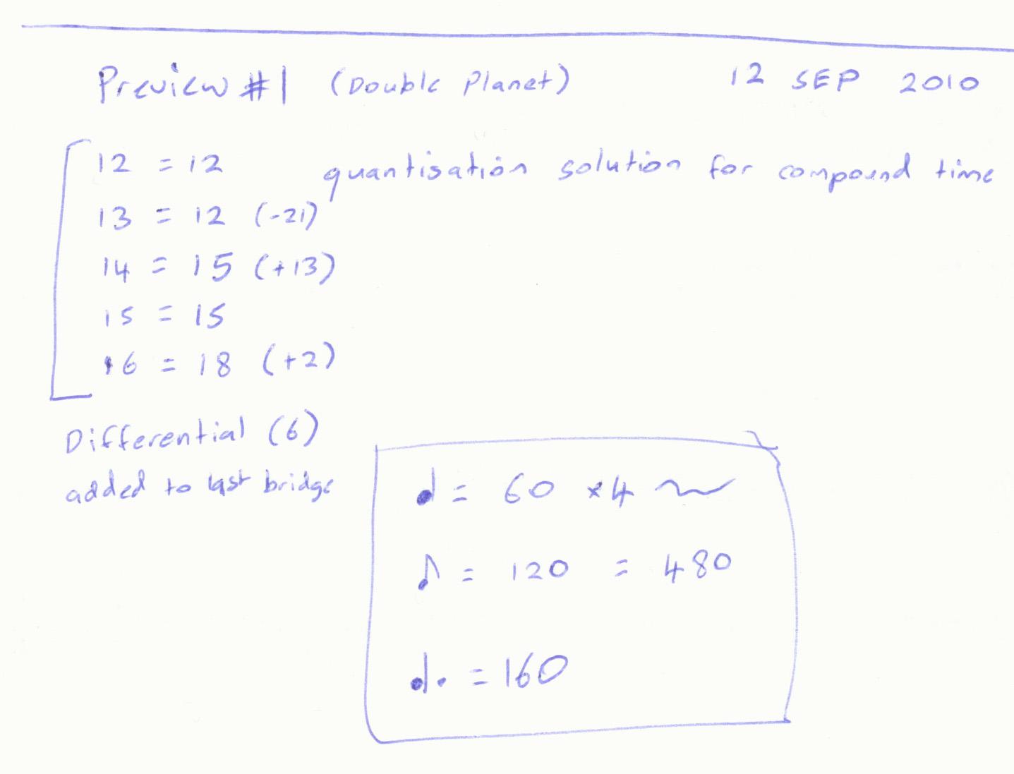 The slow arpeggios that form that backbone of the 2nd movement, Double Planet , showed both promise and difficulty when played back by the computer at 4 times the speed. In general, the fast tempo was very effective and certainly the harmonic rate of change was fascinatingly clear in rapid motion. In general the feel indicated compound time (6/8 or 12/8) due to the basic unit of 12 quavers.