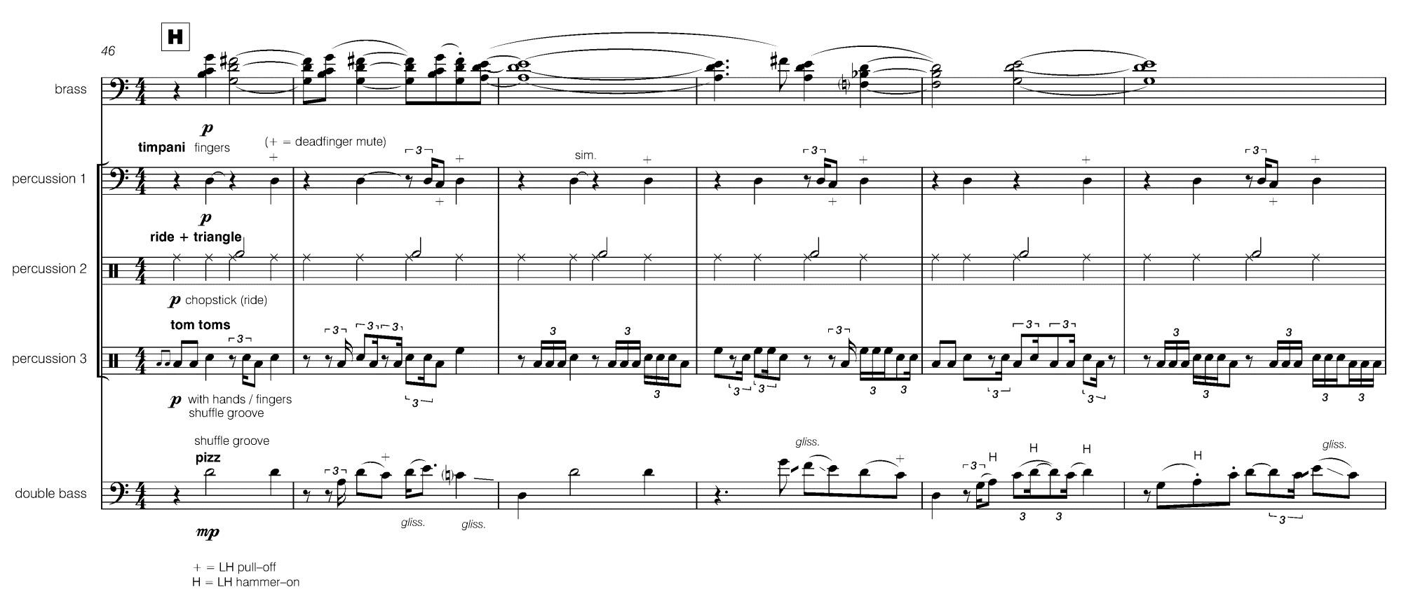 The final movement opens with percussion, winds and pizzicato strings, transforming gradually into a full arco string section. The brass are deliberately withheld until halfway through the movement and when they come in at letter H, they are accompanied by ride, triangle and tom toms (played by hand in a shuffle groove) with pizz bass: